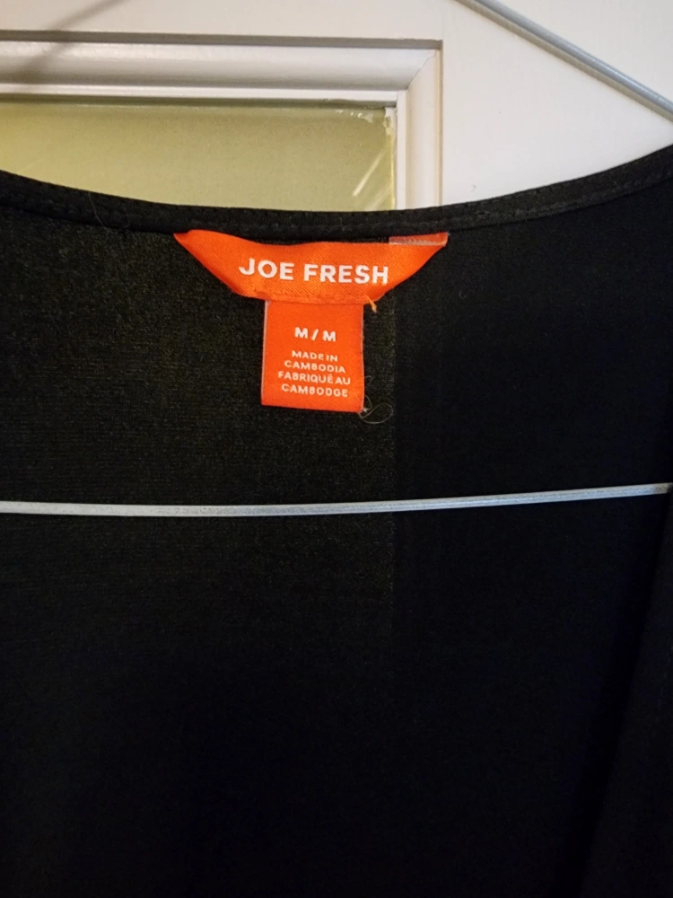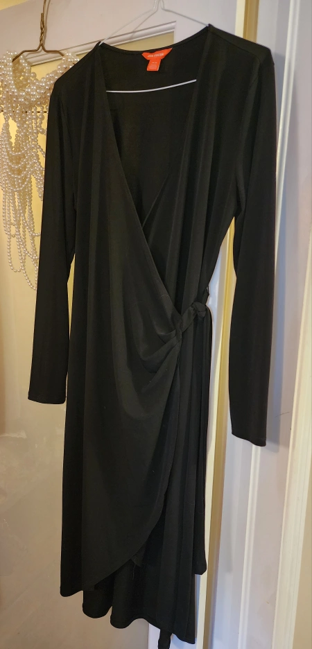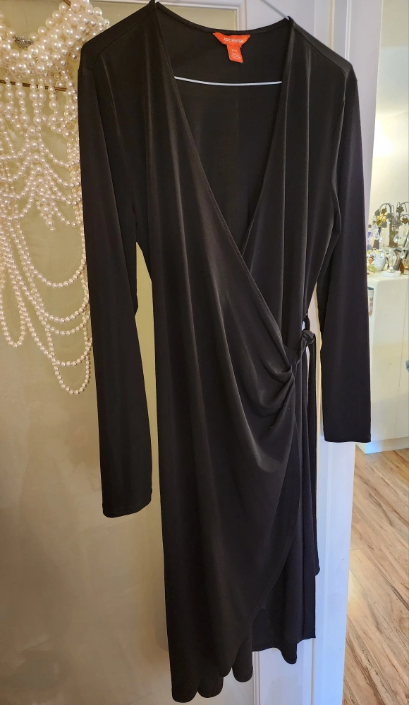 Joe Fresh black knee length wrap dress. size med . some stretch . knee length ar the front n tapers down at the back , v neck sexy neckline .