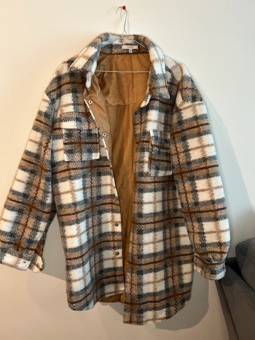 Oversized plaid jacket, brown, white, and grey plaid, button up closure