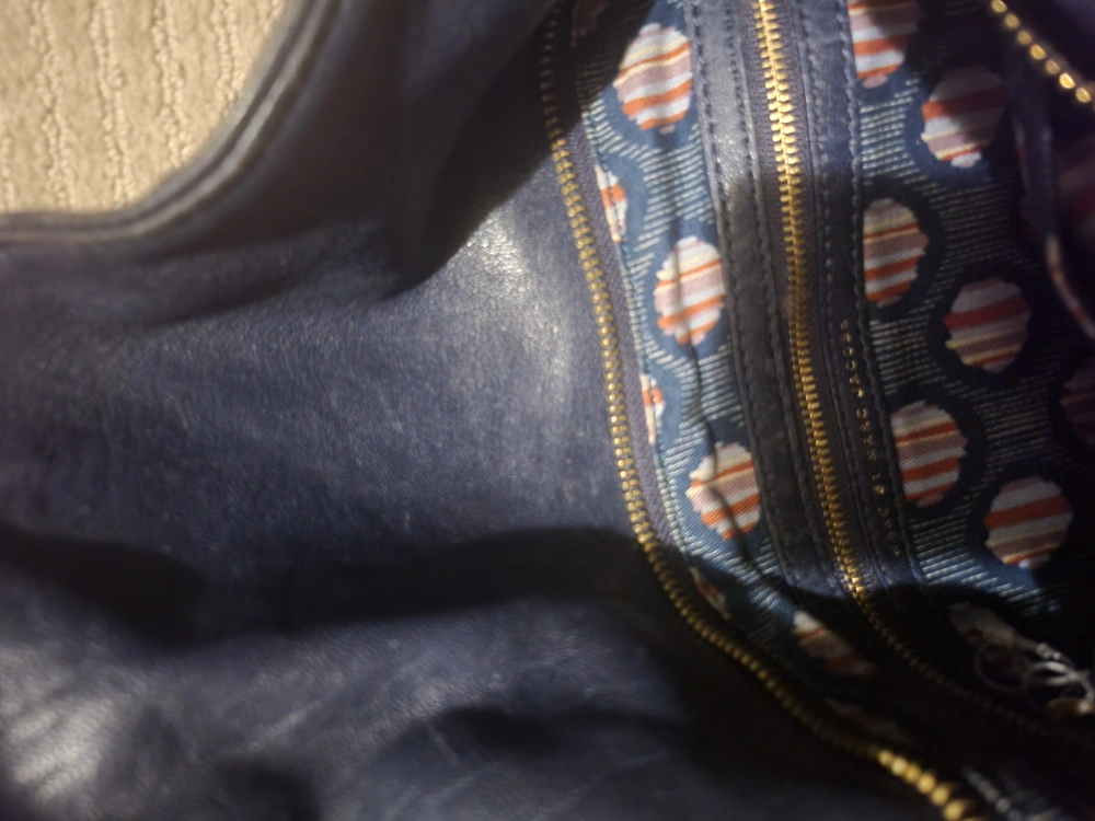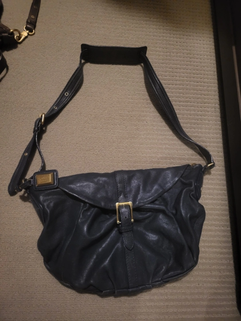Blue leather shoulder bag with gold hardware. Has a buckle detail on the front. The bag has a zipper closure and a lined interior. It includes a long adjustable strap.