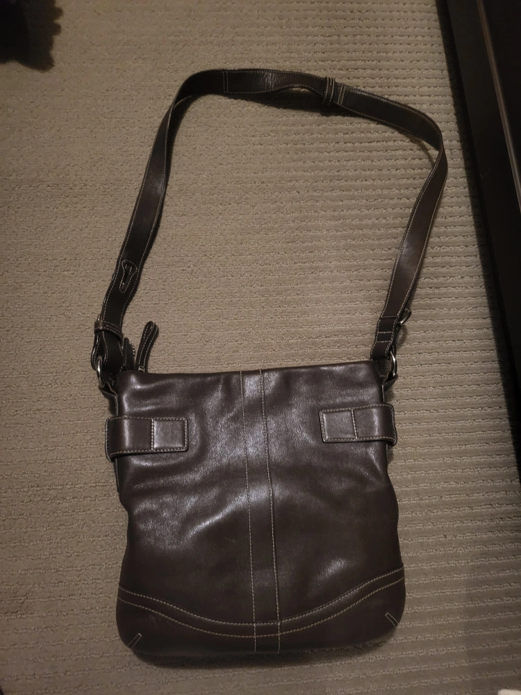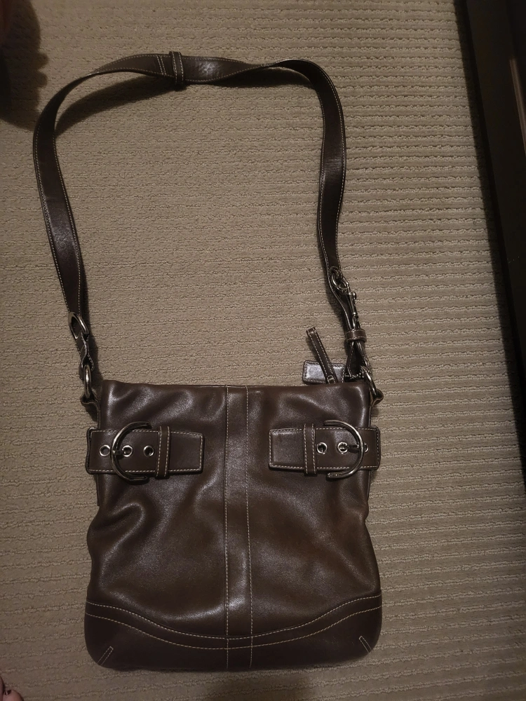 Brown leather shoulder bag with silver hardware. Features a long adjustable strap and buckle accents.