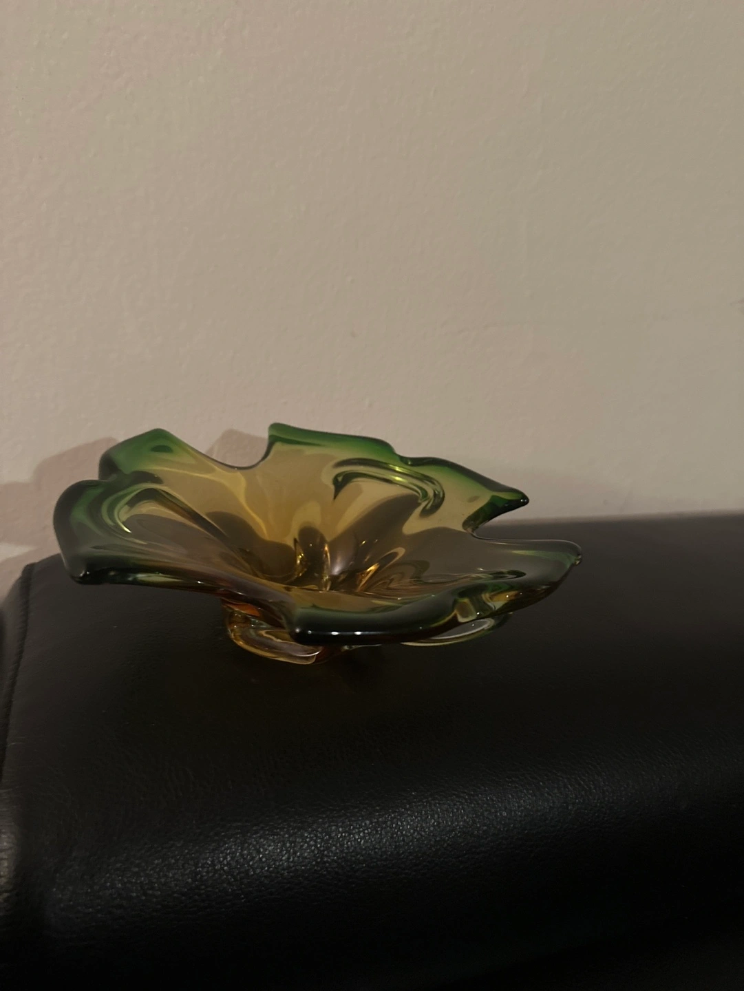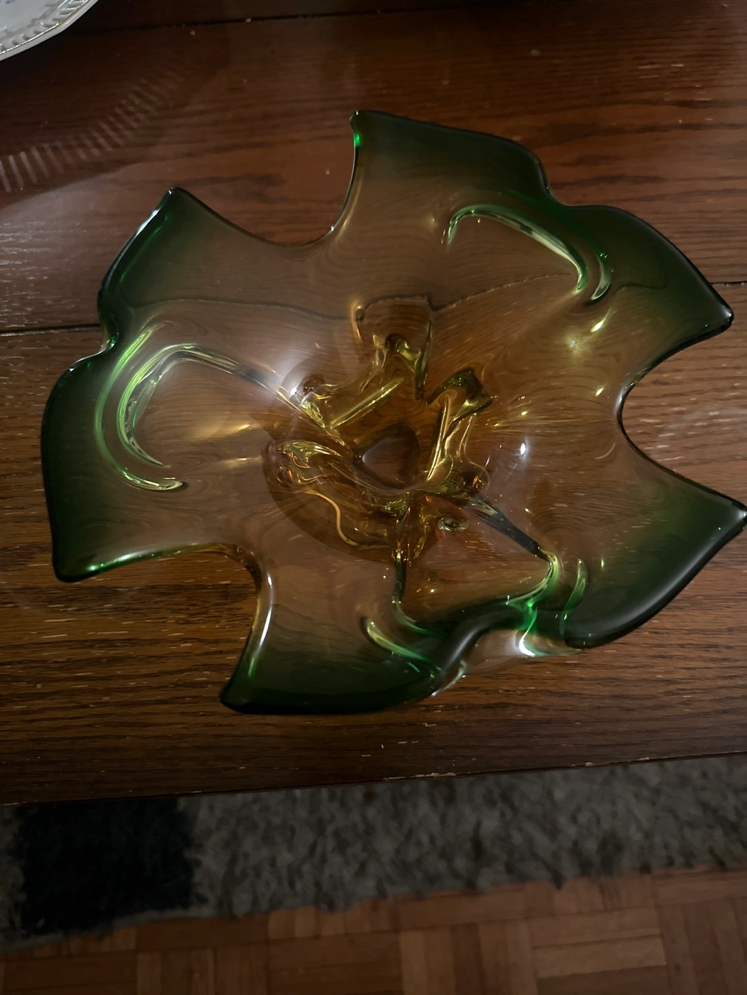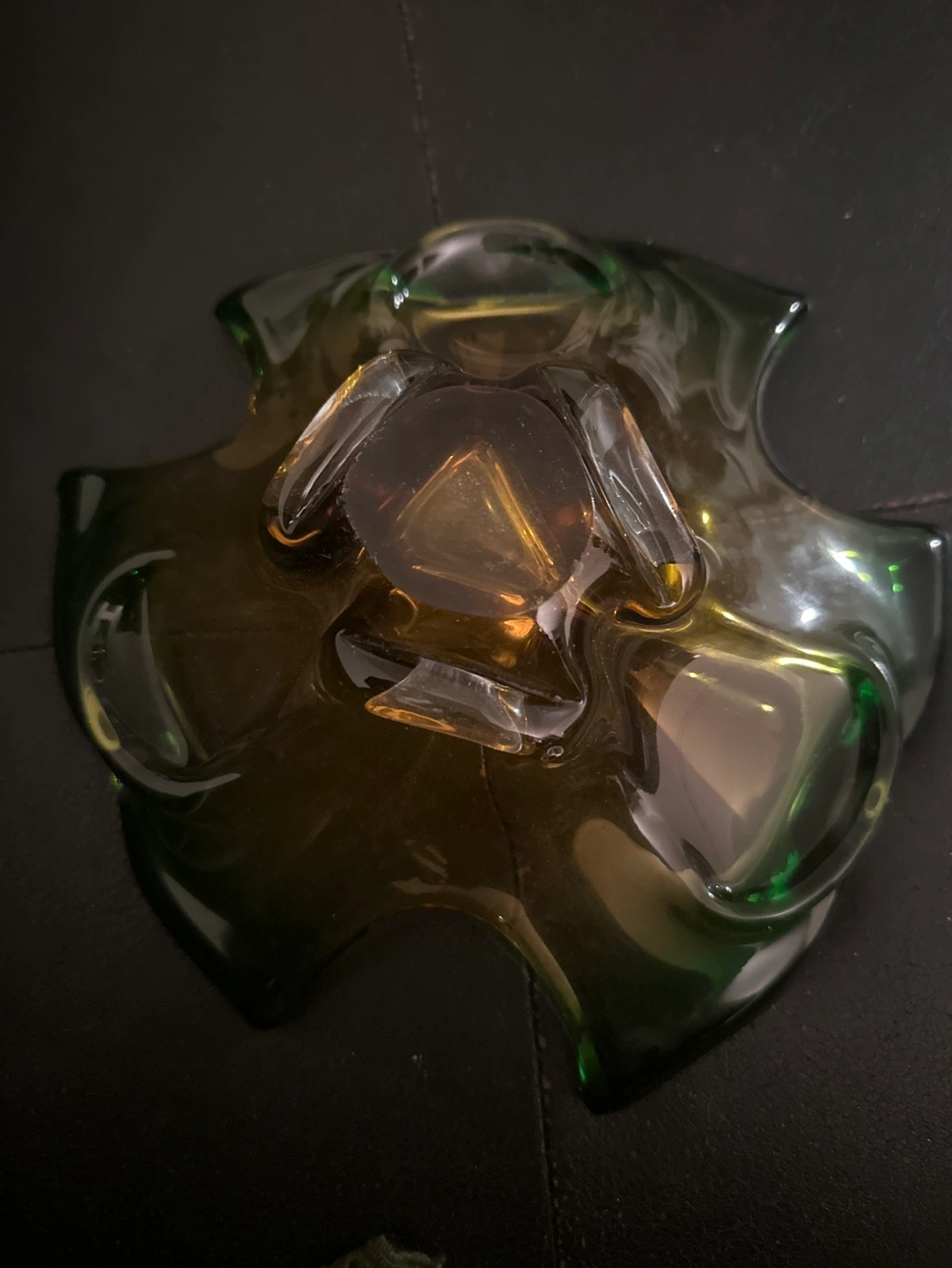 Unique vintage glass ashtray. Green and amber glass with a swirling design.