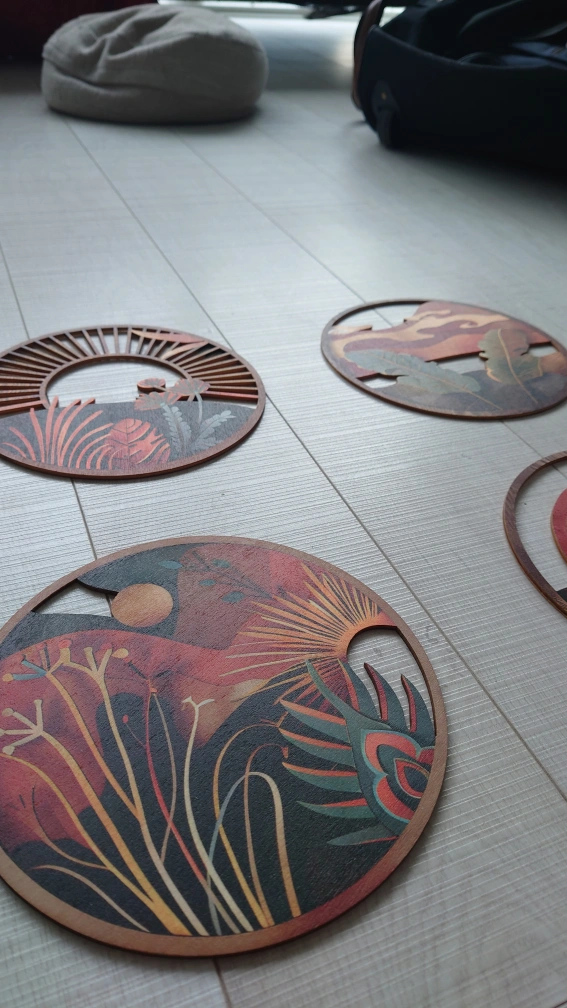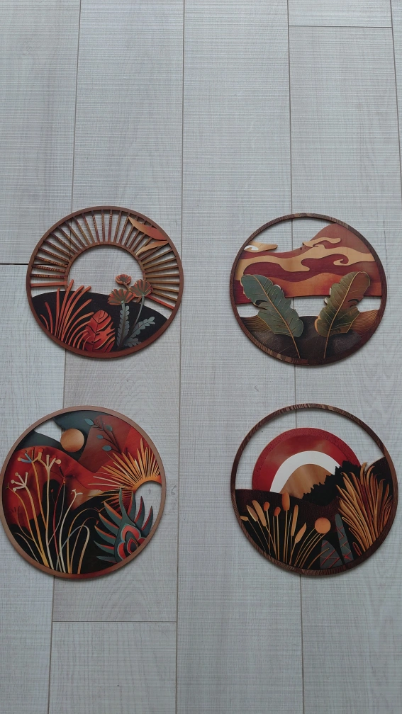 Set of 4 round wall decor with nature-inspired designs. Each piece features different scenes with plants and animals, in vibrant colours. The pieces are made of wood and have a modern style. never used, comes with 3M wall tape.