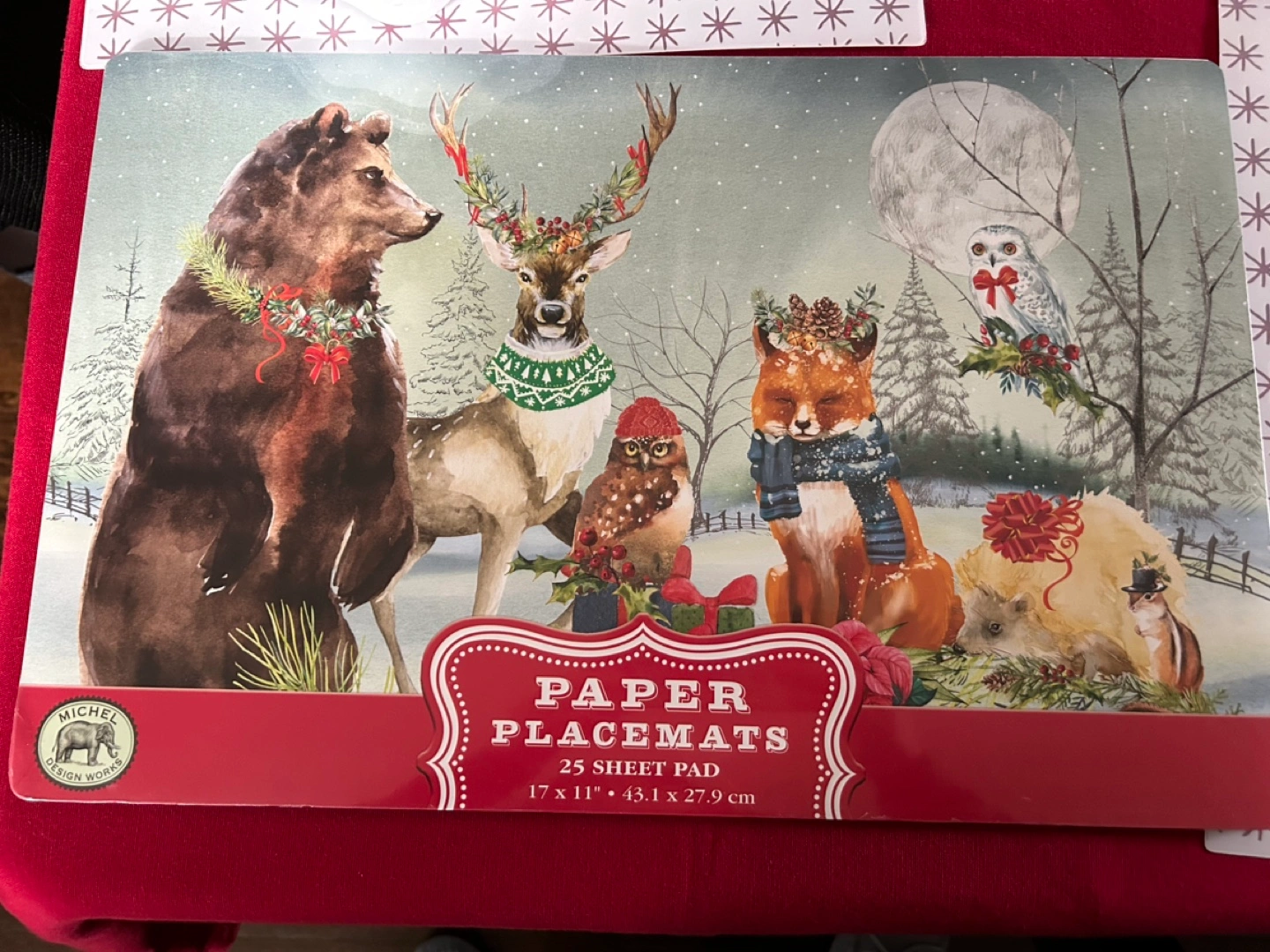 25 sheet pad of paper placemats featuring a winter scene with a bear, deer, fox, owl and hedgehog. 17 x 11 inches