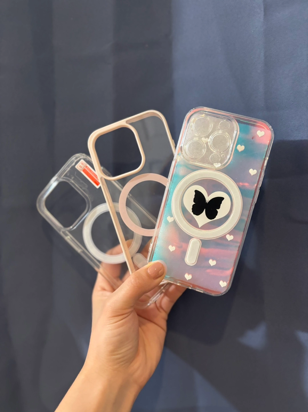 Three iPhone magnetic cases. Clear with a butterfly and holographic design, a clear with white borders , and a clear with light pink borders.