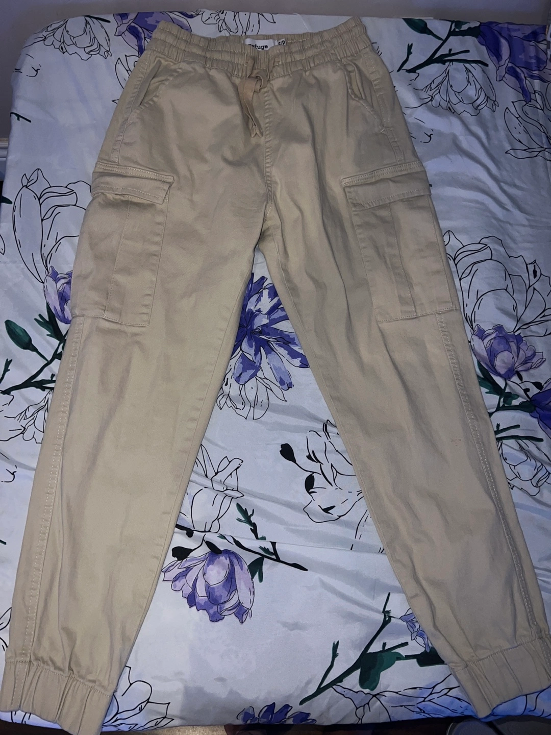 Beige cargo pants with multiple pockets and an elastic waistband. Barely worn, fits a size medium too. Pick up!