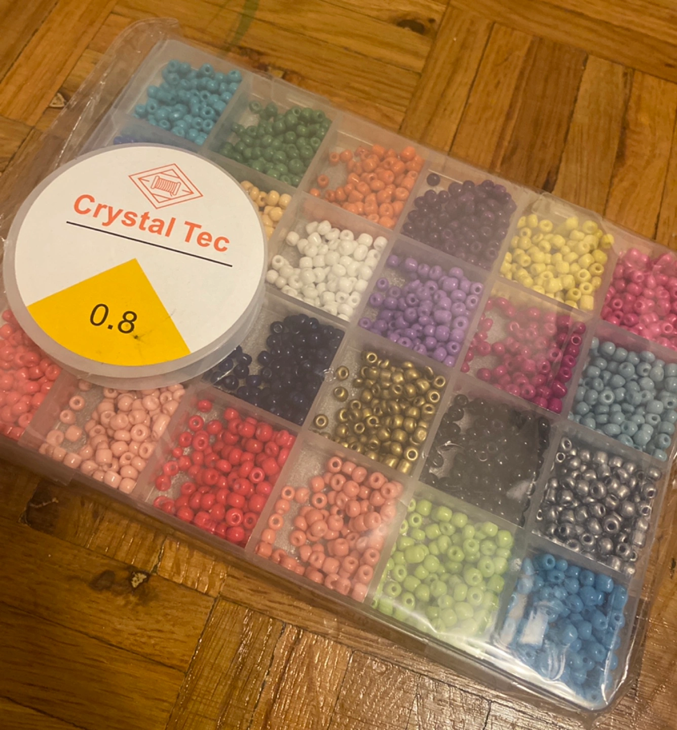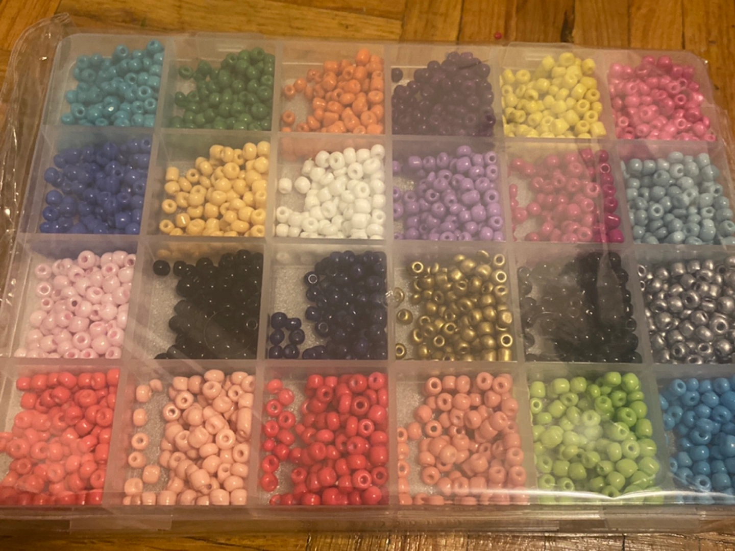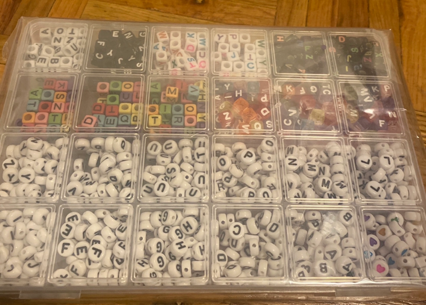 Variety of beads in assorted colours and shapes, includes letter and round beads.