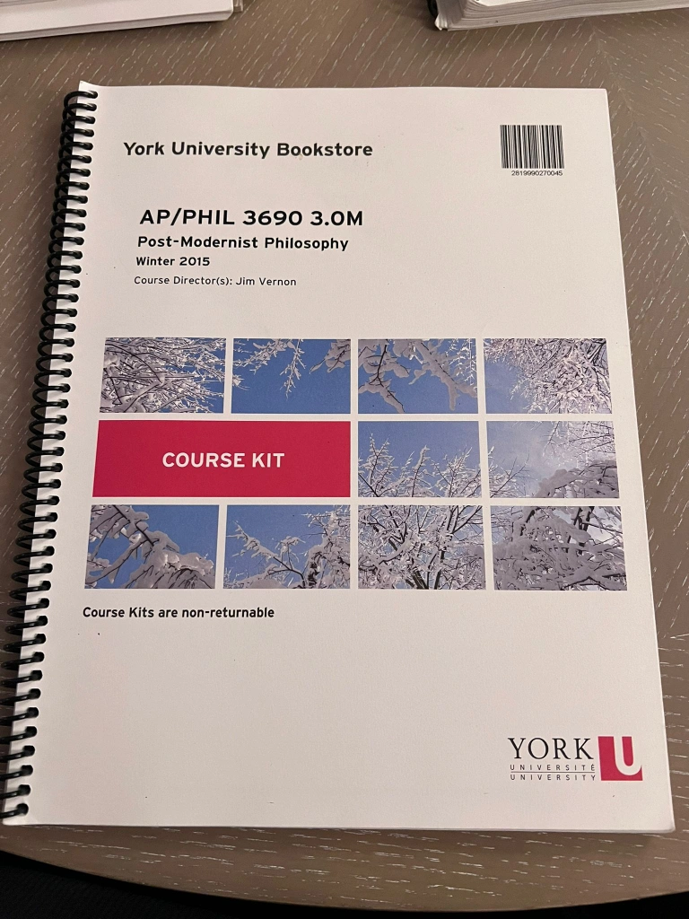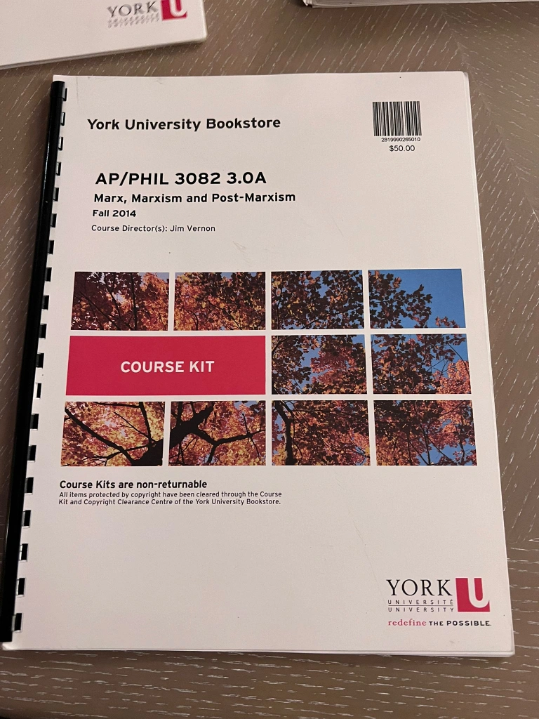York University, Toronto. Philosophy Undergrad Course Kits. $10 each or $30 for all four books. AP/PHIL/HREQ 3180 3.0M Conversations with African Philosophy AP/PHIL 3690 3.0M Post-Modernist Philosophy AP/PHIL 3082 3.0A Marx, Marxism and Post-Marxism AP/PHIL 4071 3.0 Kant's Moral Theory