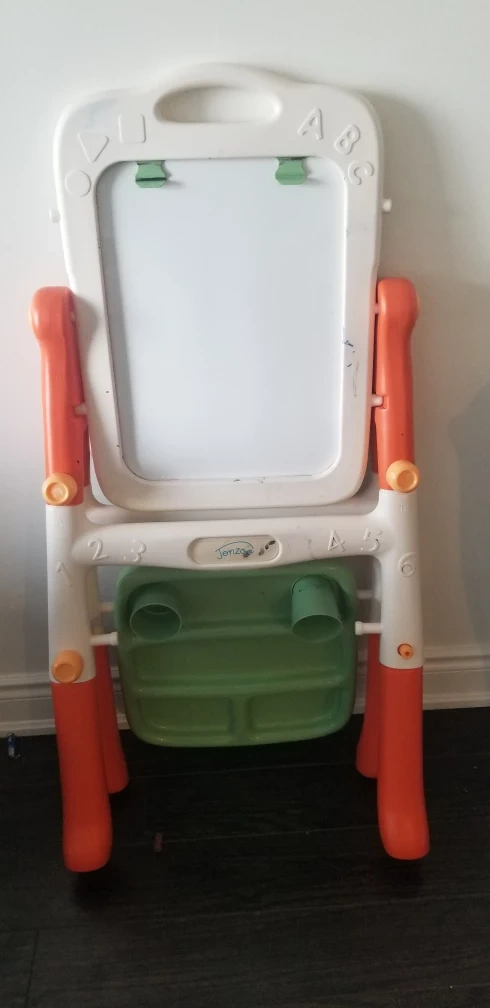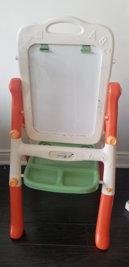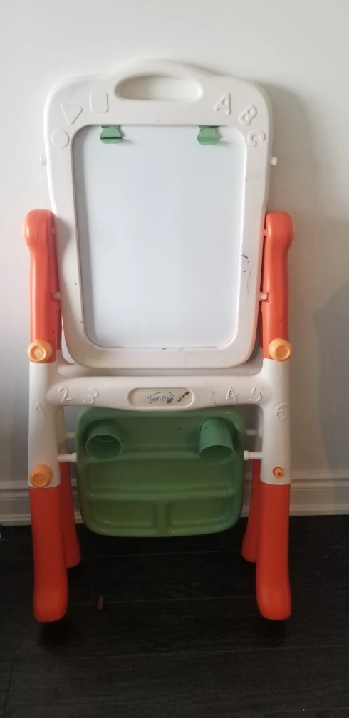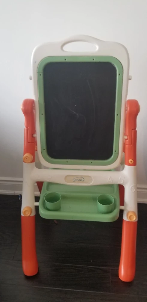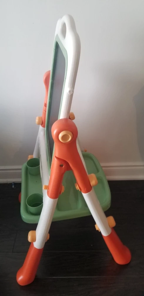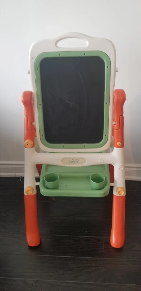 double sided Whiteboard and chalkboard, green tray with two cup holders. Orange legs.in good condition board holds study and strong.
