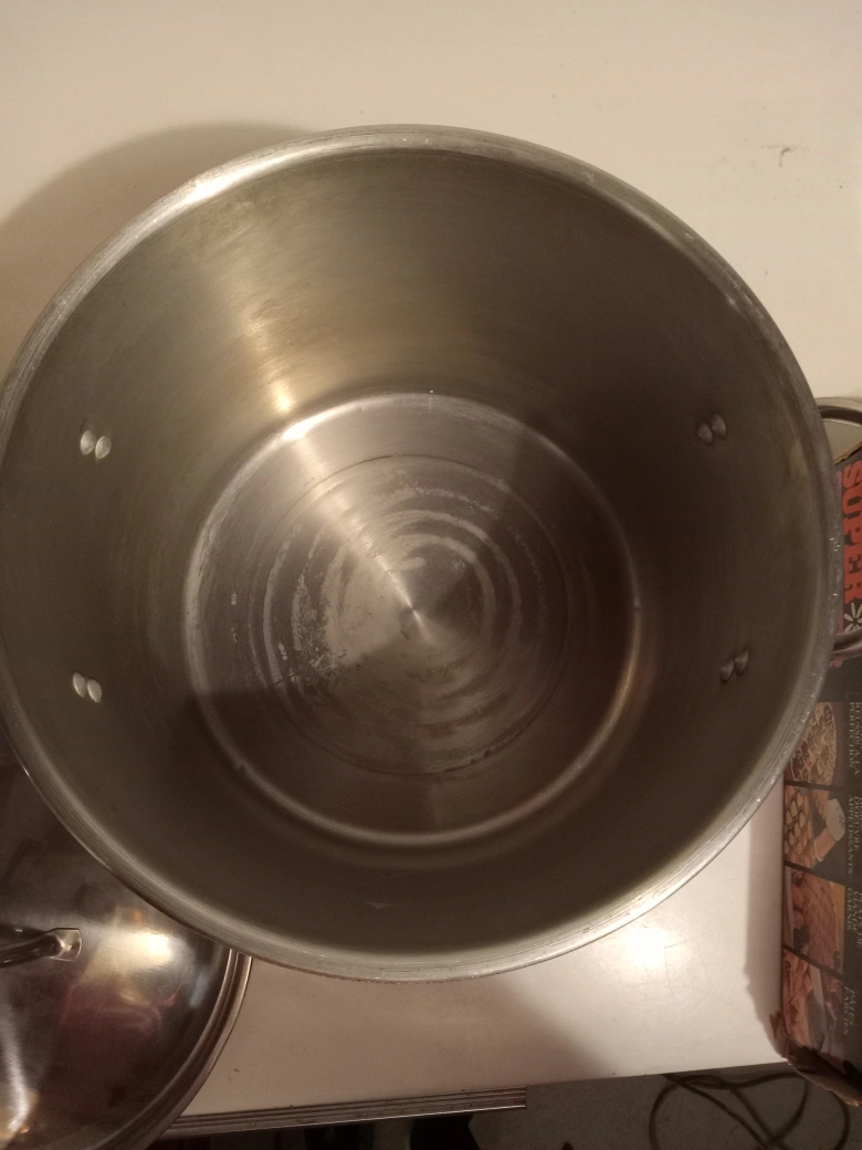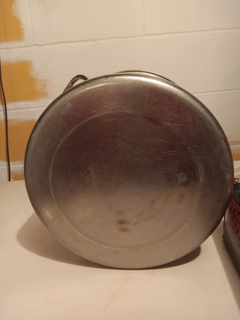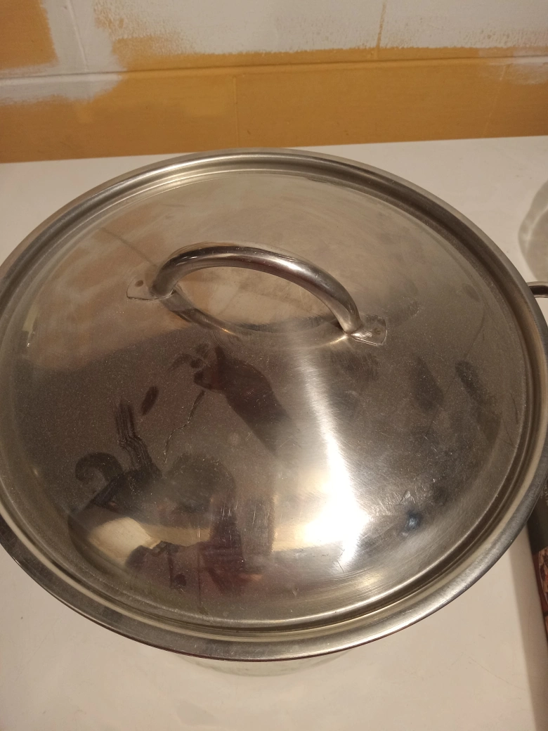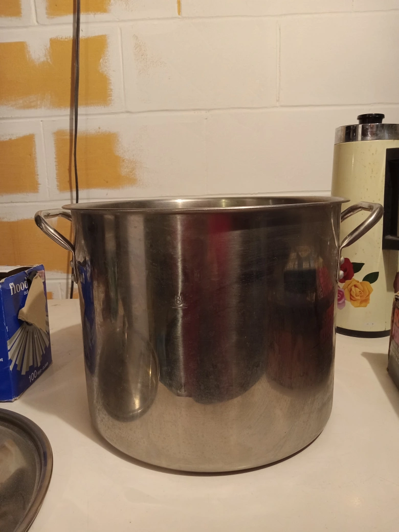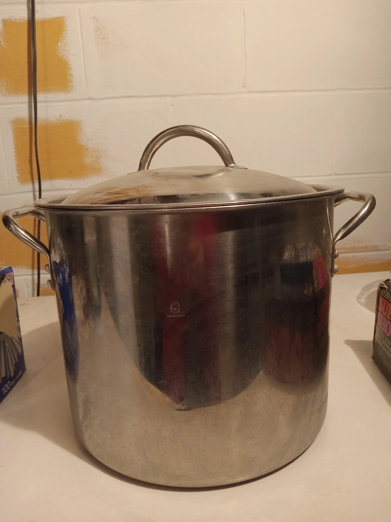 Large stainless steel stock pot with lid. Suitable for stovetop use. Well used and loved.