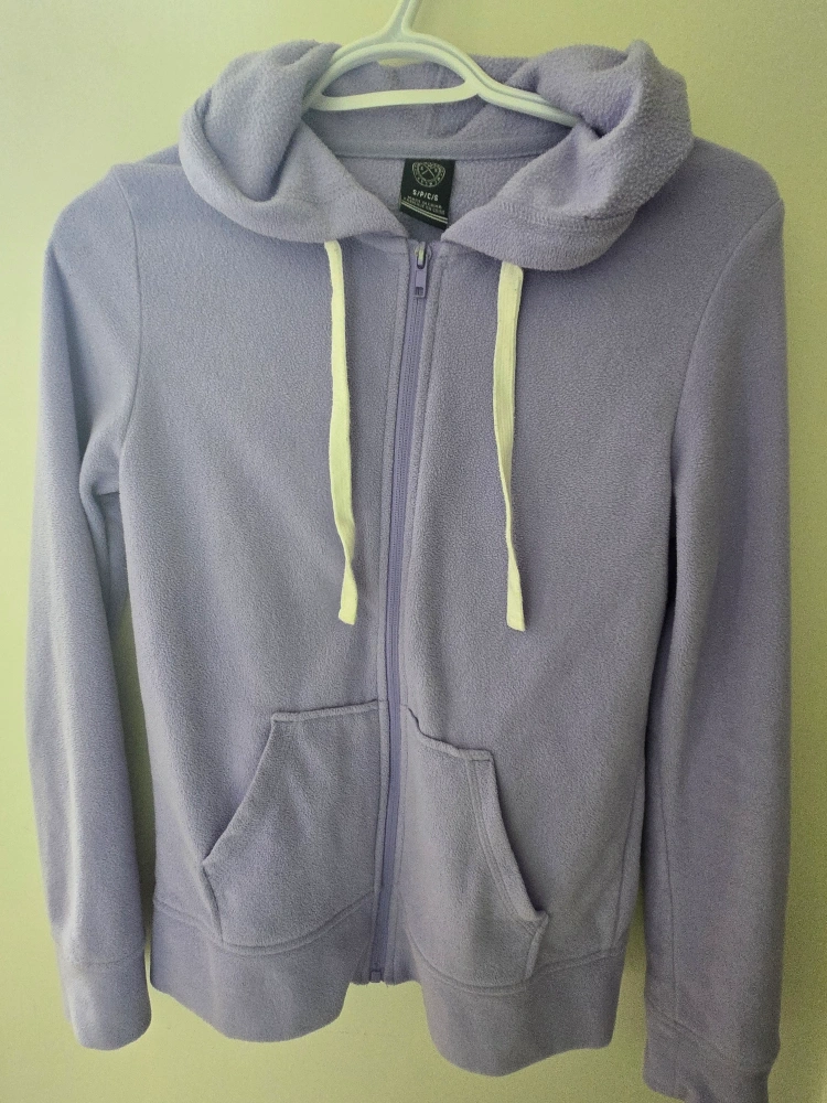 Long sleeve, zip-up hoodie with a hood and pouch pocket. White drawstrings.
