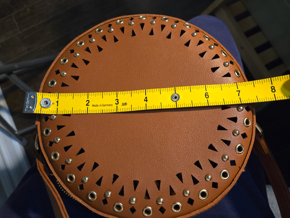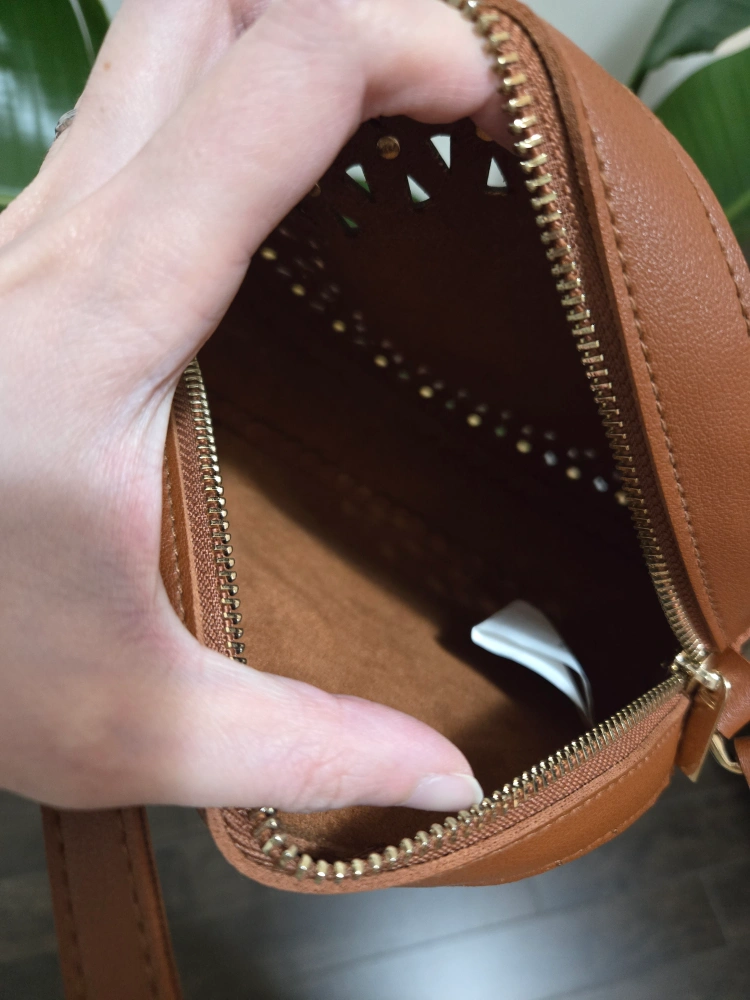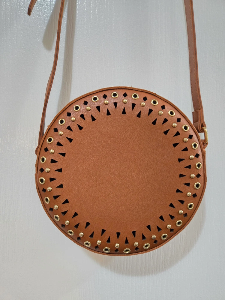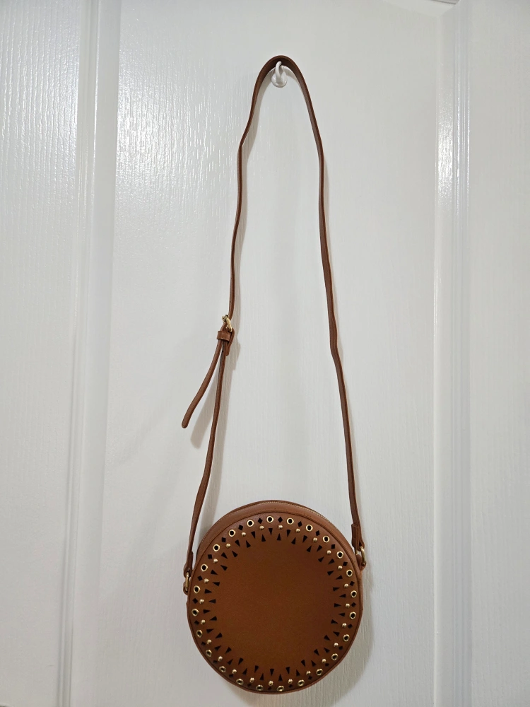 Brown circle crossbody bag with gold accents and a zipper closure. The bag has a long adjustable strap. Pickup nearby Finch & Don Mills.