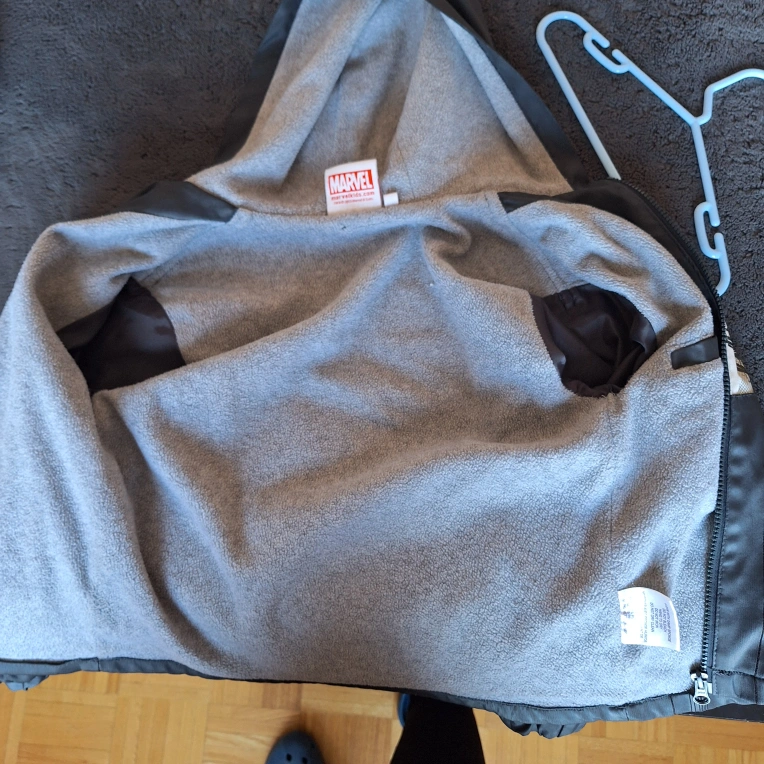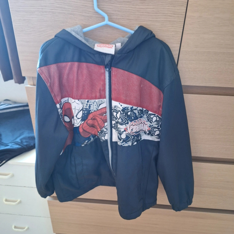 Black jacket with red and grey accents, Spiderman design on the front, fleece lining, zipper closure, hood. Great spring jacket for Spiderman enthusiasts.