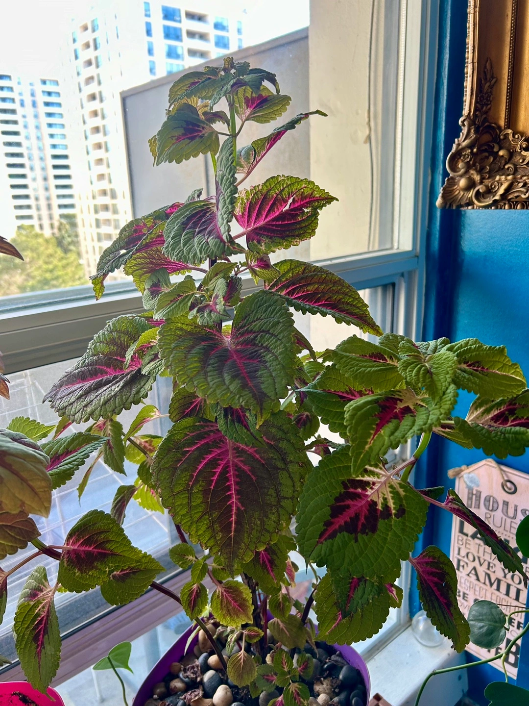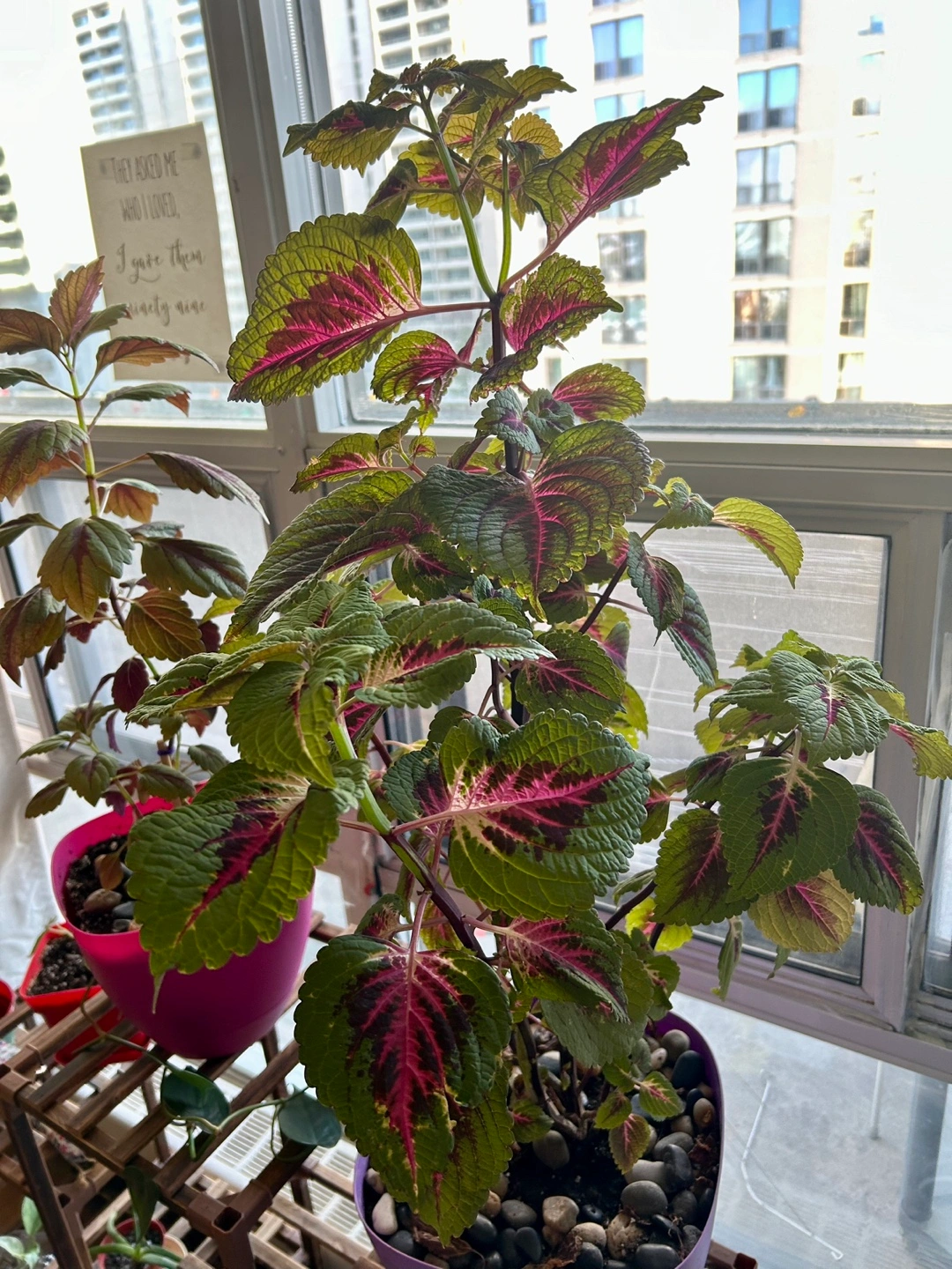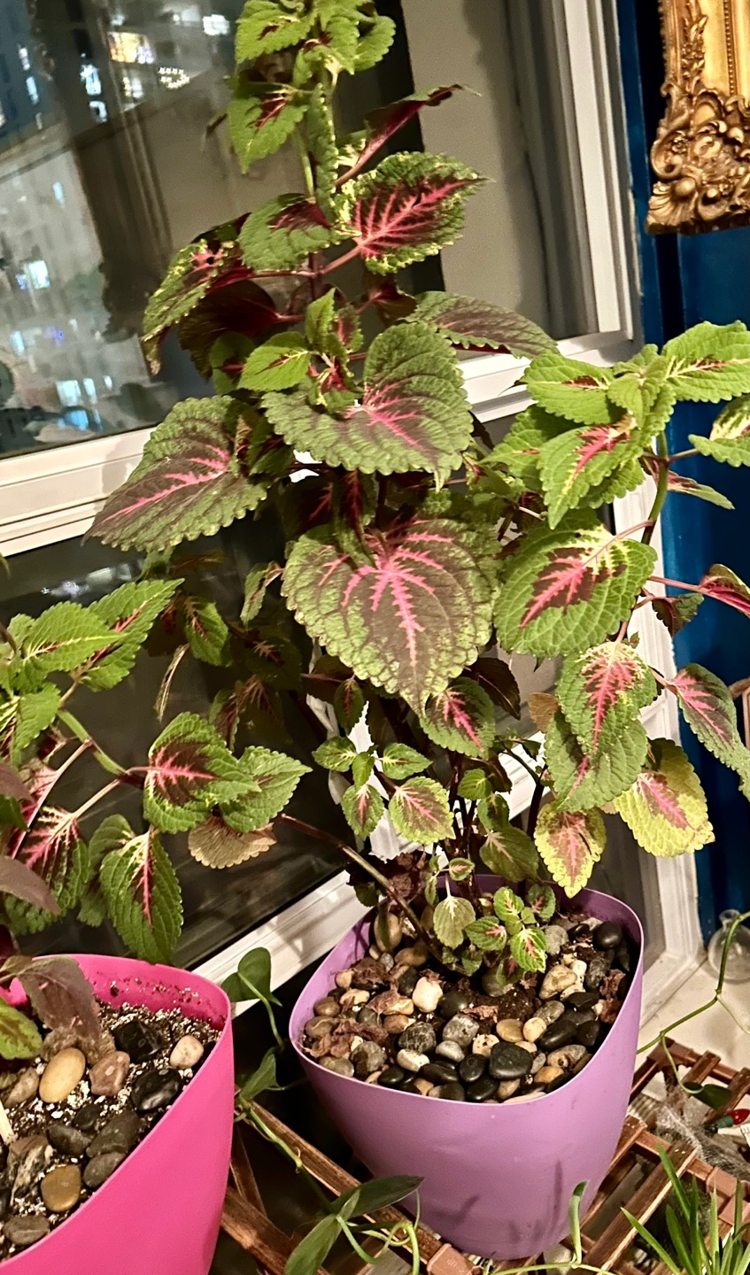 Large Coleus plant in a purple pot with decorative rocks. Healthy and vibrant.