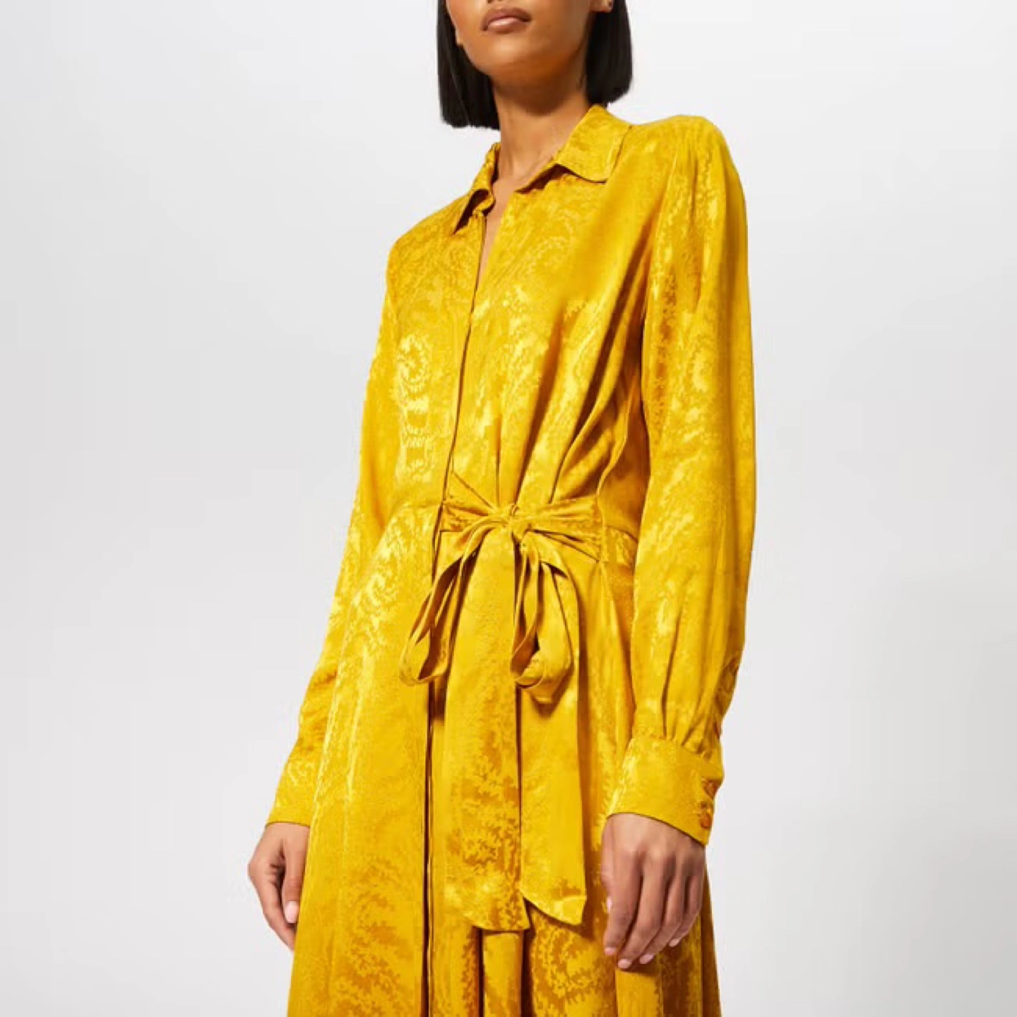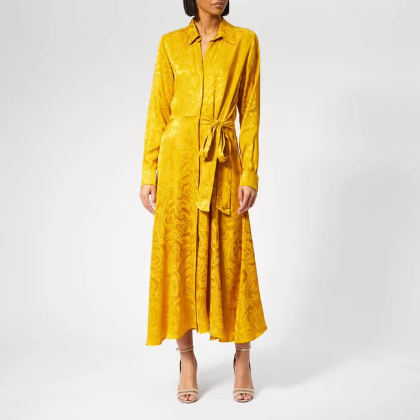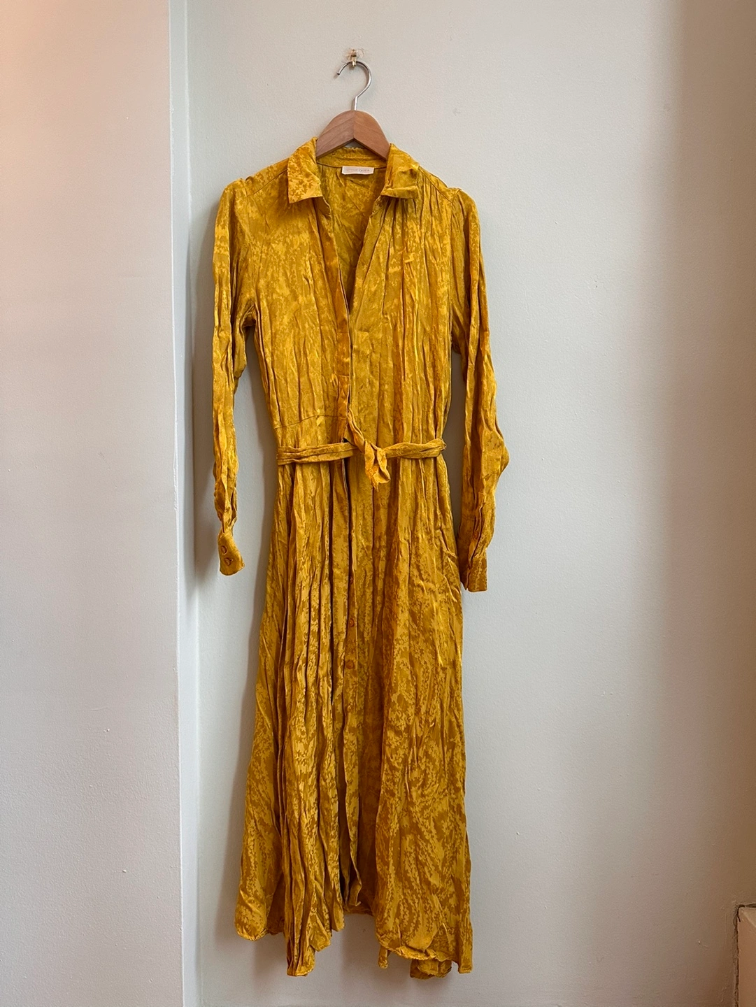 Stunning yellow gold color dress in perfetto conditions. Baily Dress in Golden Swirl print. Cut from soft woven viscose below the knee, this shirt dress features a flowy fit with a button down front, a button down collar and a drawstring at waist. It is designed in a golden yellow color woven with an all-over swirl pattern. - Never used - bought in France - 100% Viscose - Delicate machine wash, and hang dry Available for pick up Retail $440. My price $100