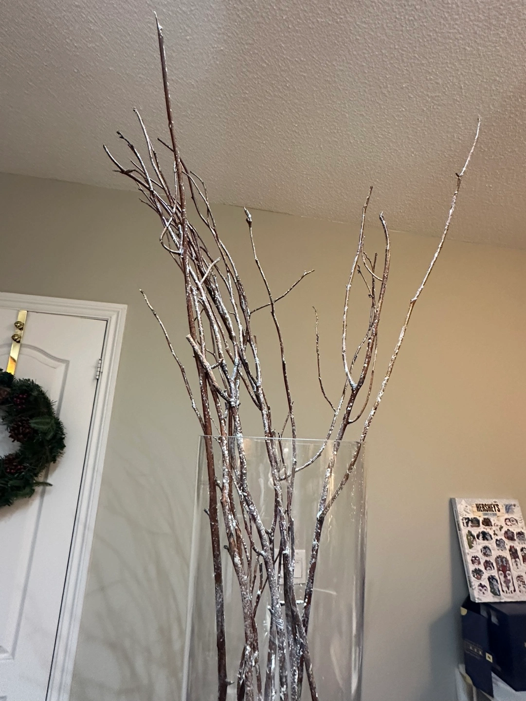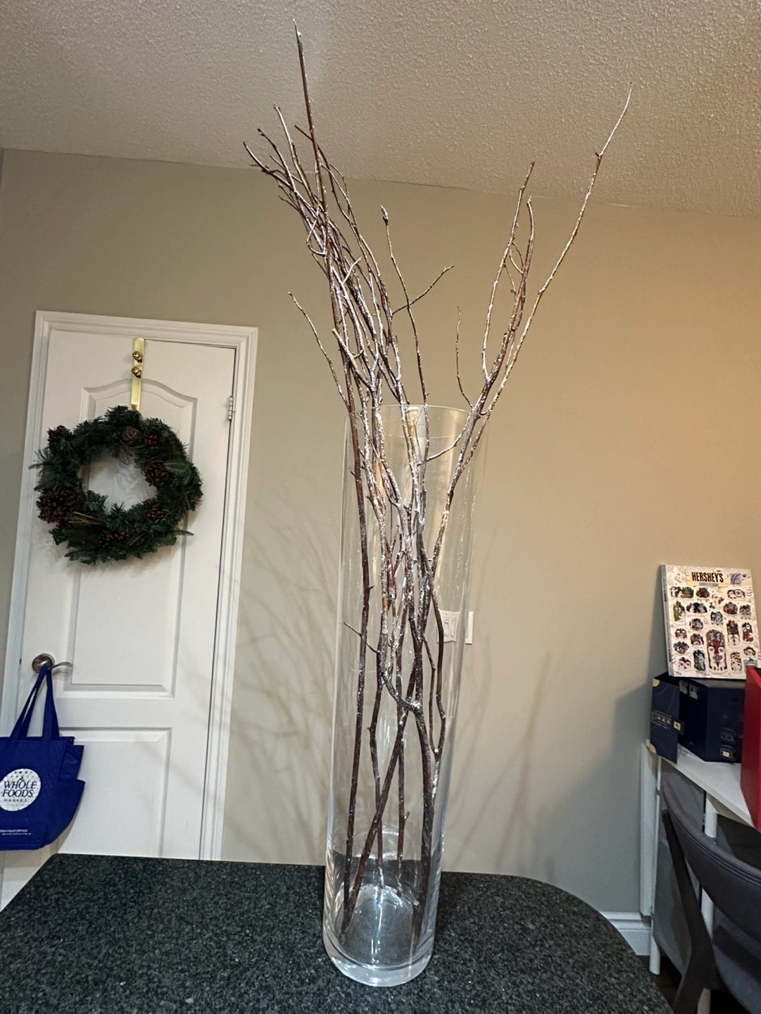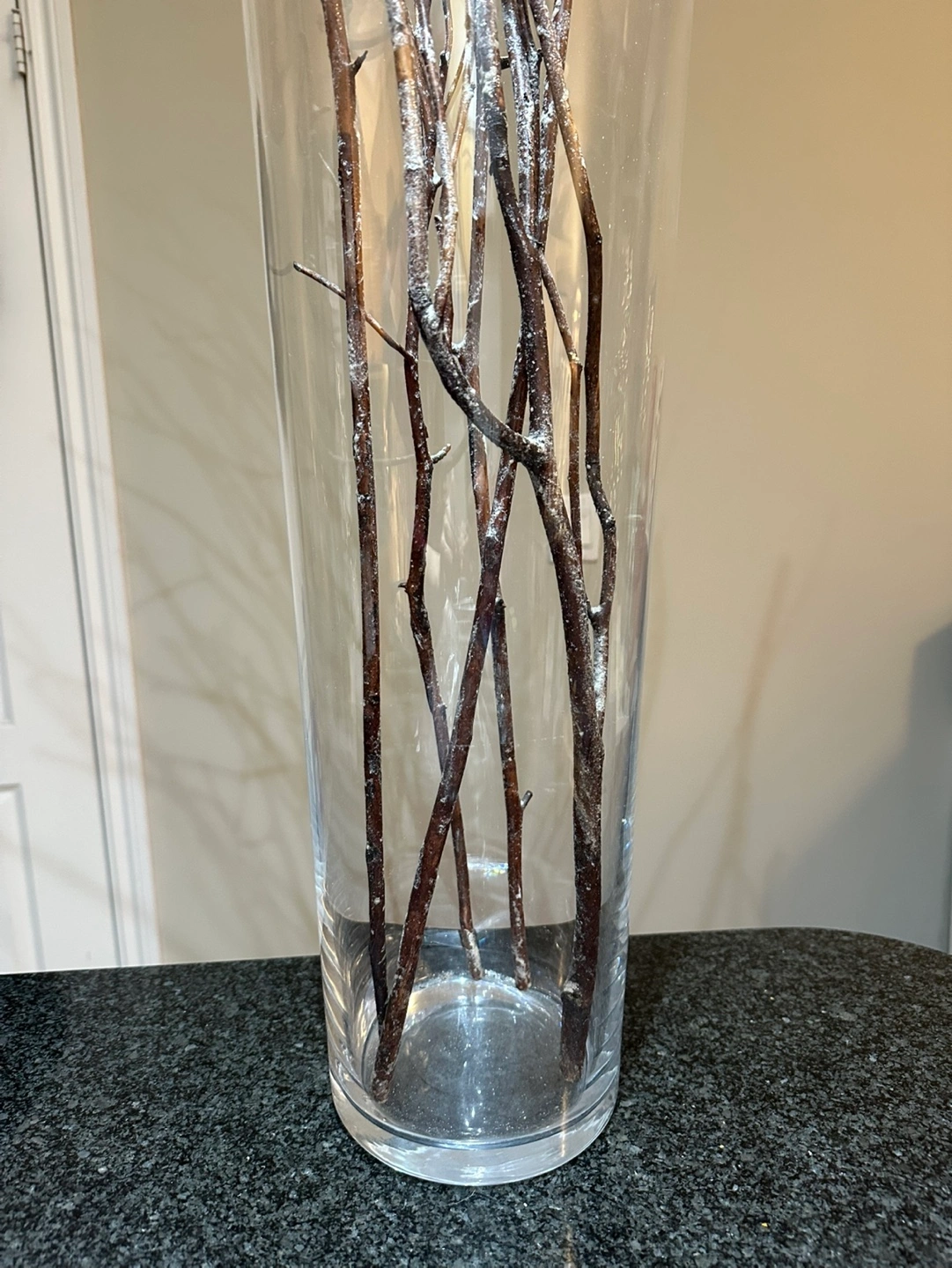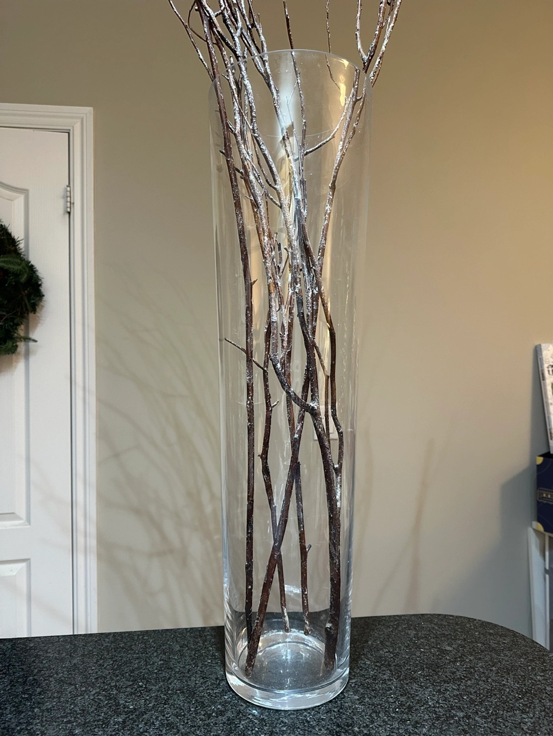 Tall glass vase with frosted branches - perfect minimalist holiday and year-round decor Glass vase is 27” tall Branches are 45” tall