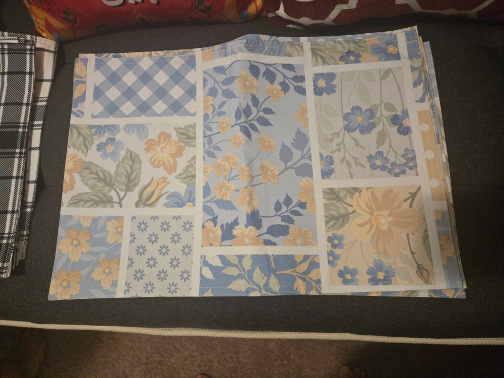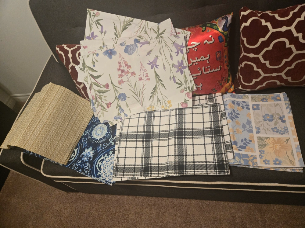 Set of 20 placemats in various designs. Includes 4 gold, 4 floral, 4 plaid, 4 blue floral and 4 blue patchwork patterns. $4 each set.