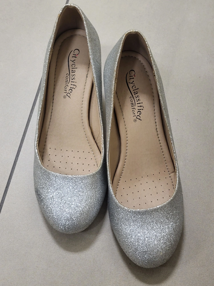 Cityclassified Comfort silver glitter pumps Size 7.5 Low heel of 2 inches Size 7.5 New open box The original price is way more + Tax Here, Price is the lowest/firm to go away faster. Please call/ text for a faster response. 647 855 6217 Meet Ups: 1. Tim Hortons at Jane Park Plaza 2. Any subway station from Kipling to young and Bloor station NOTE: If u like, please see my other ad postings. Leather shoes, dress shirts, dress pants, jeans, Tennis/Squash Badminton Rackets, Exercise/Bike stuff, and more….. Mostly, brand name stuff is new or like new to go away in about half price. Thanks for your time.