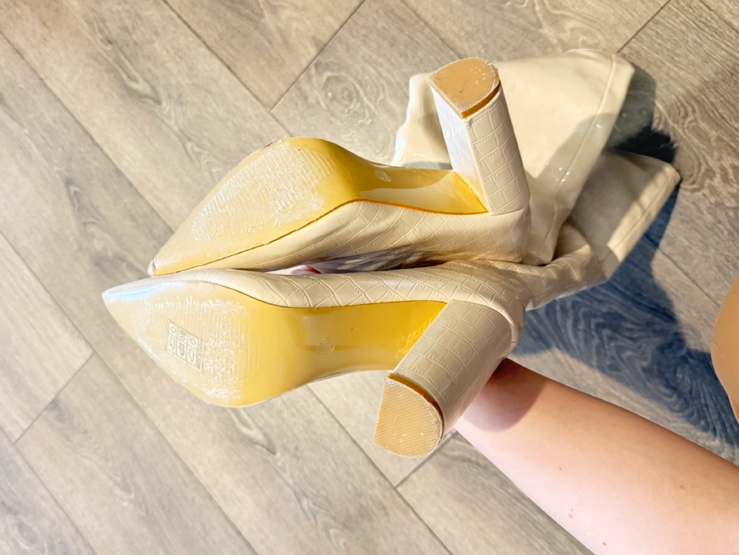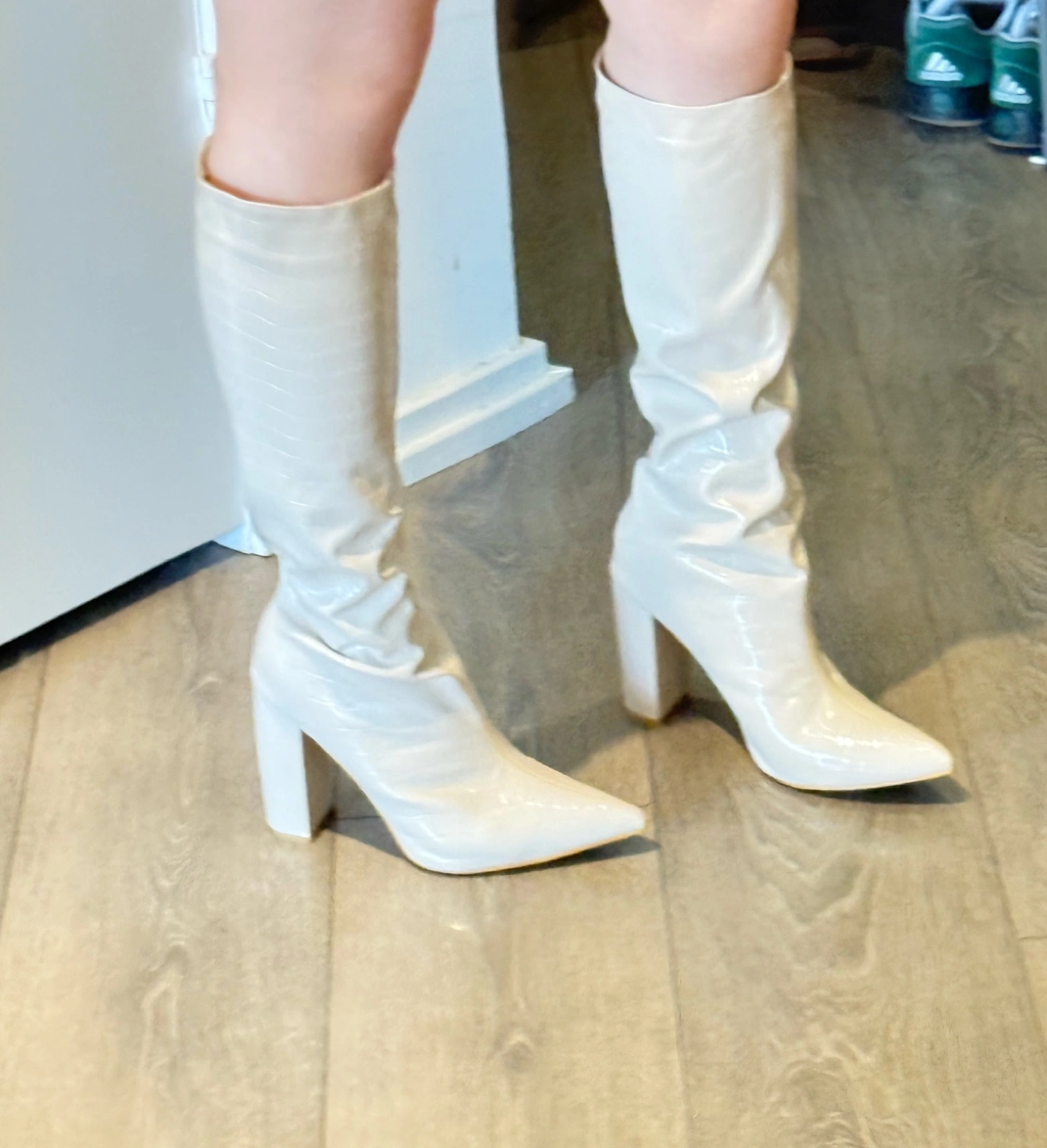 White knee high boots with a pointed toe and block heel. Crocodile embossed leather. Never Worn out only tried at home. Condition can be seen from the pictures. Purchased from Browns for over $170. Selling at a big discount! Buy three items from my listings and get one under 10 for free! Multiple purchases come with decent discounts!
