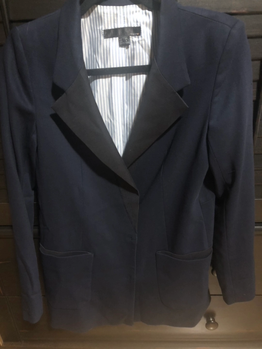 Long sleeve blazer with a black collar. Two pockets on the front and button closure. Lined with a blue and white striped fabric. Pick up @ midtown or downtown🤗