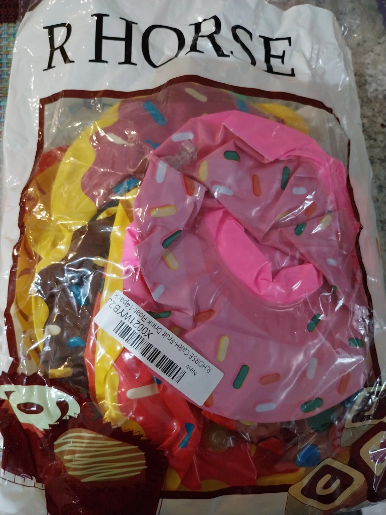Inflatable pool/bath floats shaped like doughnuts or fruits. 14 pack