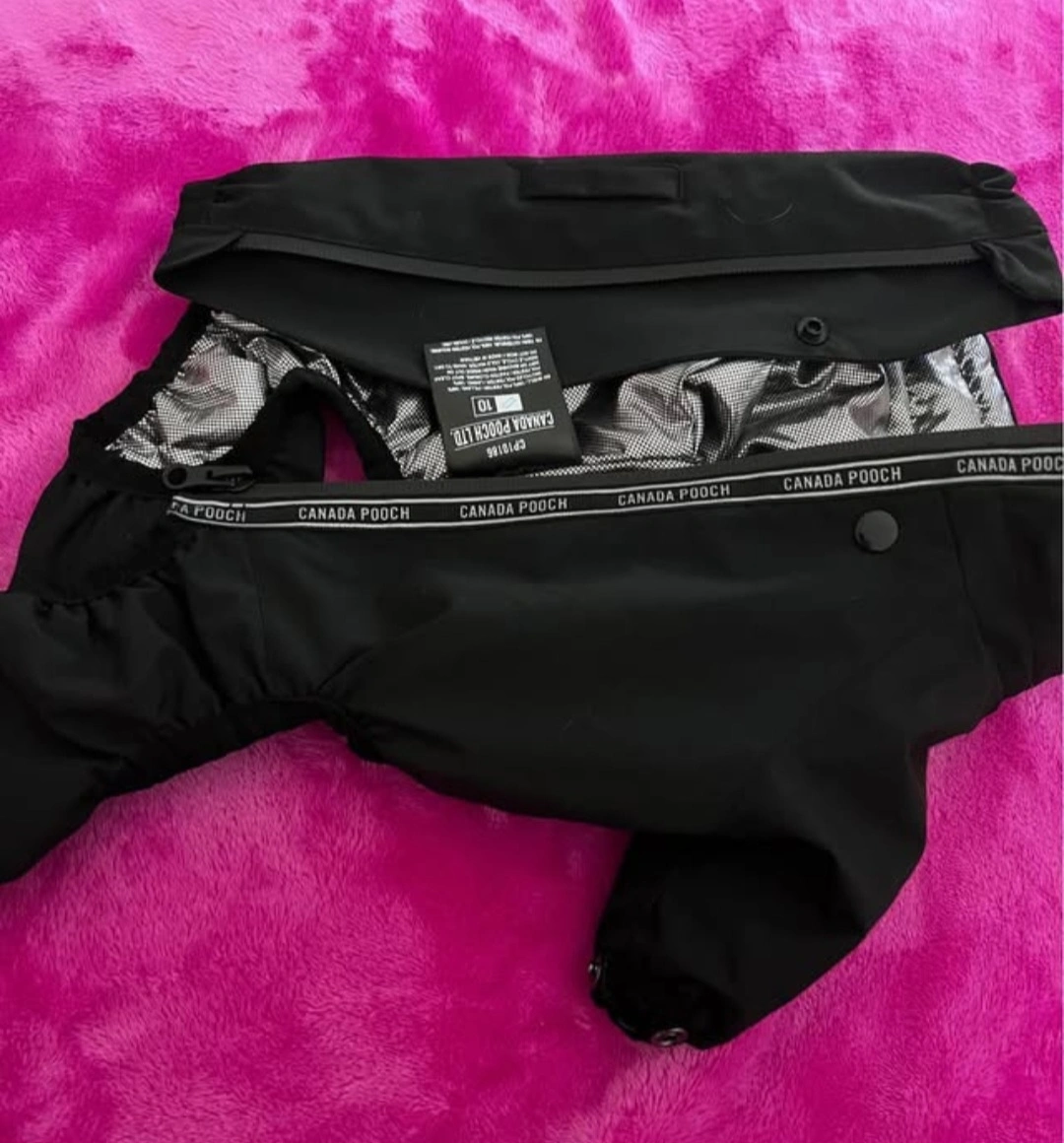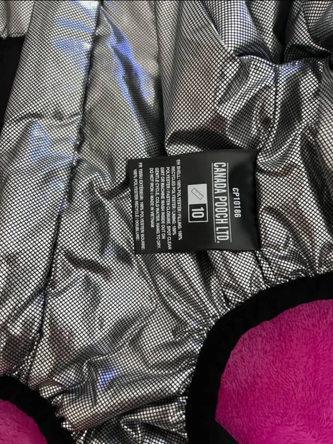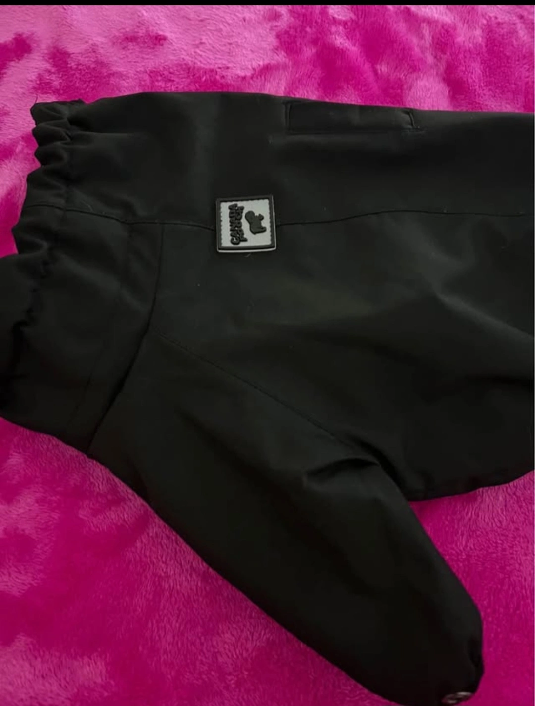 Was only put on once and was to big. Black dog winter jacket. Size 10. Has a zipper and button closure. Features a hood and reflective accents. Has a pocket on the back.