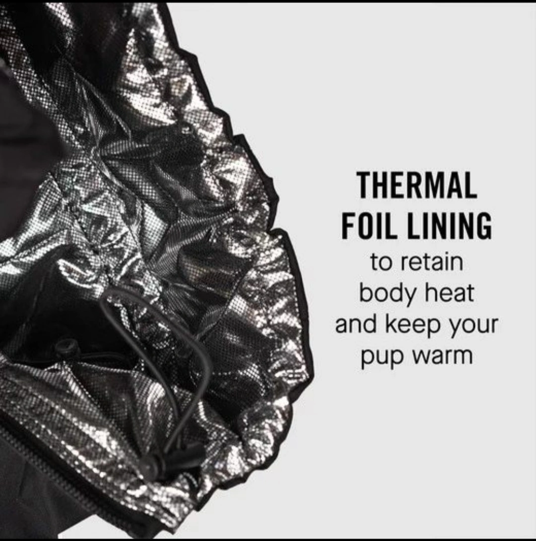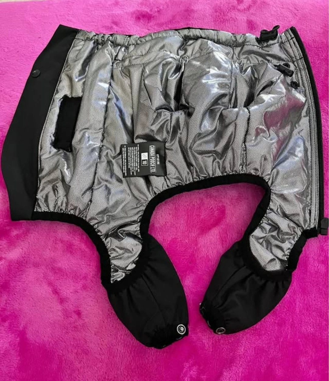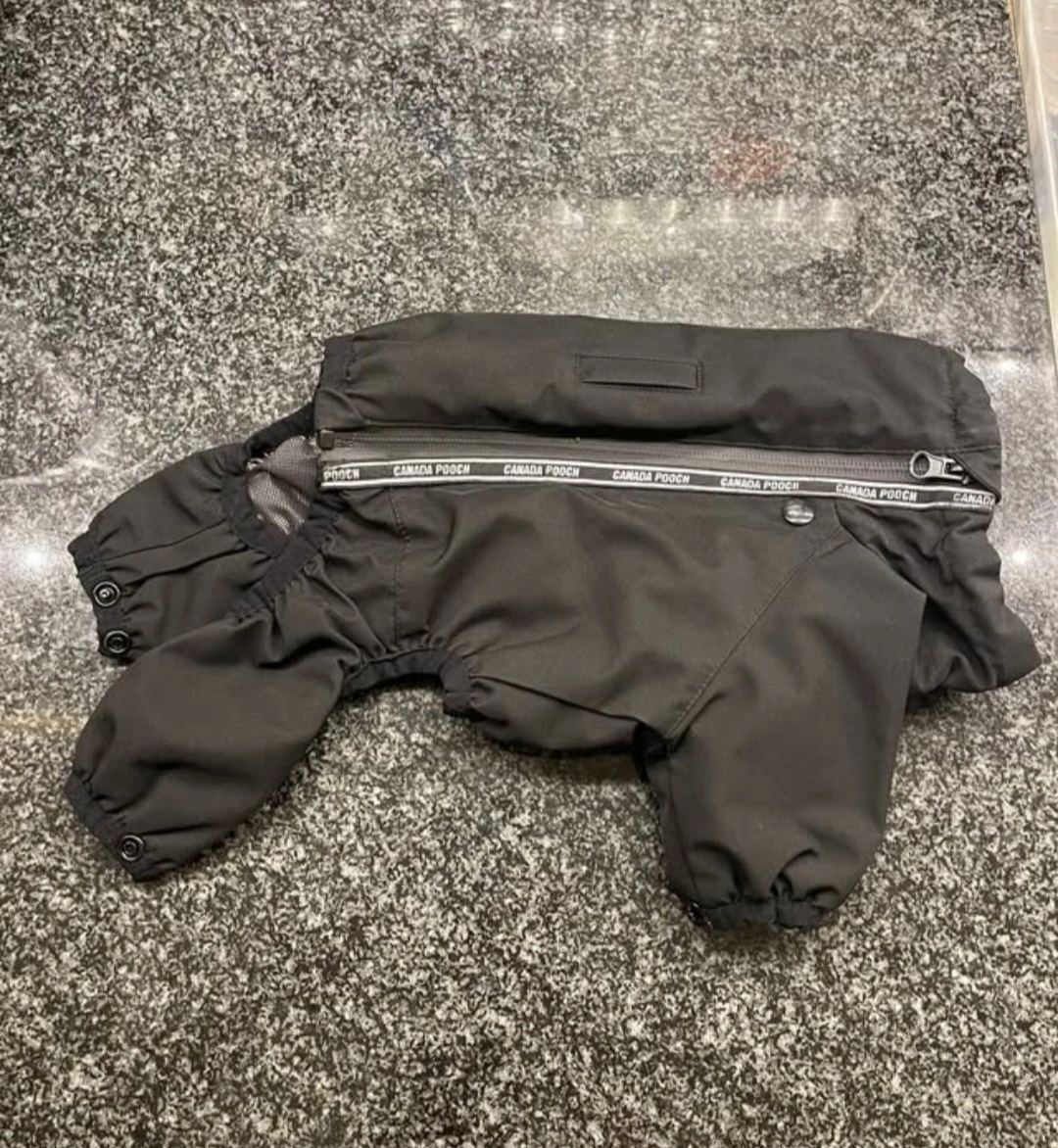 Was only put on once and was to big. Black dog winter jacket. Size 10. Has a zipper and button closure. Features a hood and reflective accents. Has a pocket on the back.