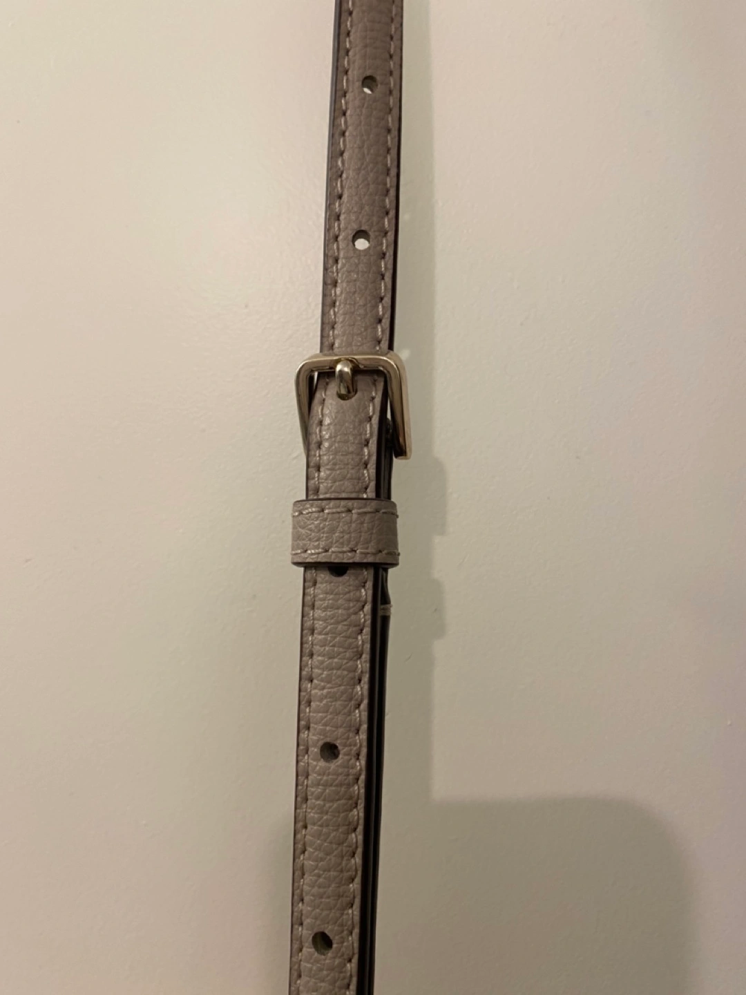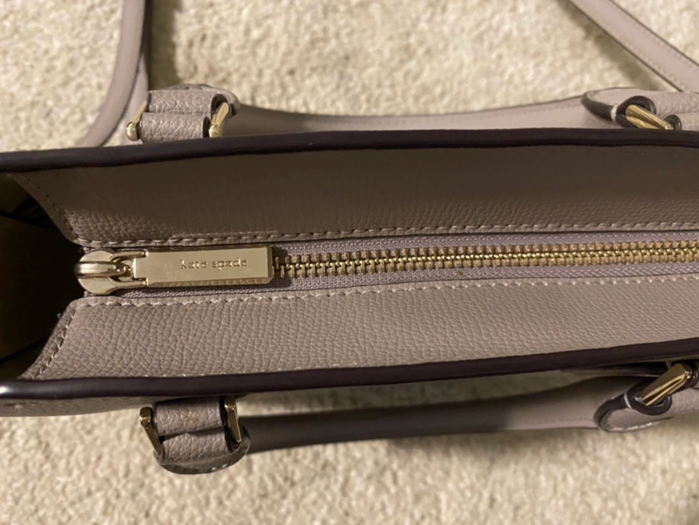 Purple- Grey satchel bag with a shoulder strap. Small/medium in size with gold hardware. Slight wear on the bottom buttons and inside bag but nothing on the material outside. One small pocket inside and zippers close. Unknown handbag type but bought for over $250 around 2 years ago.
