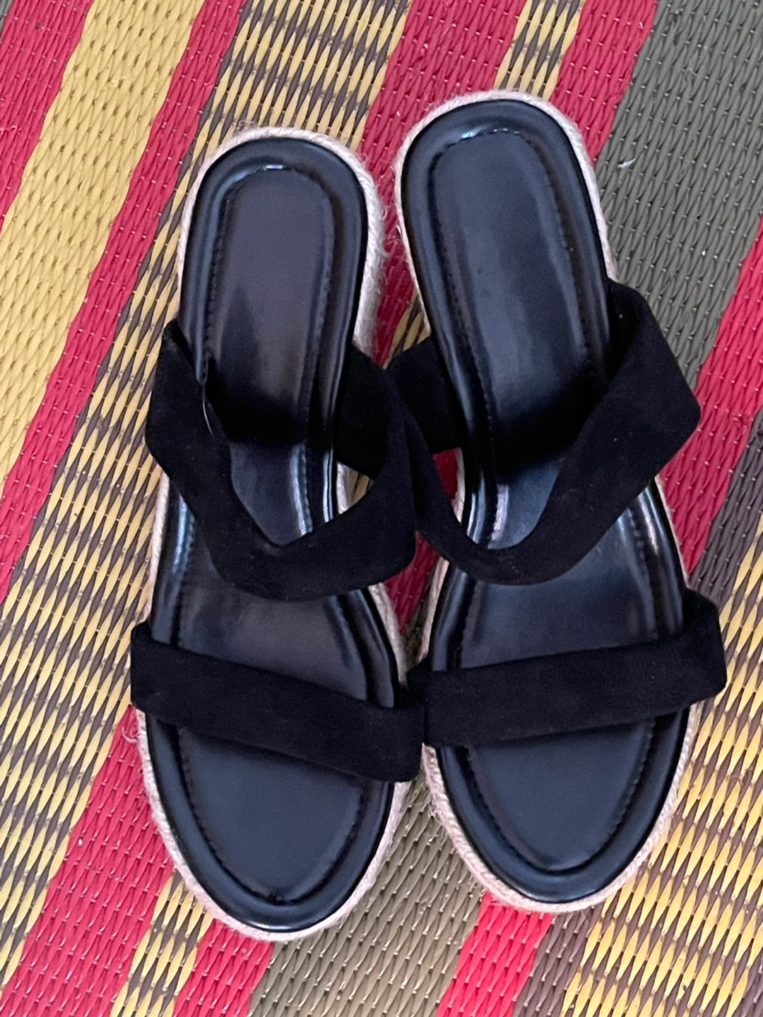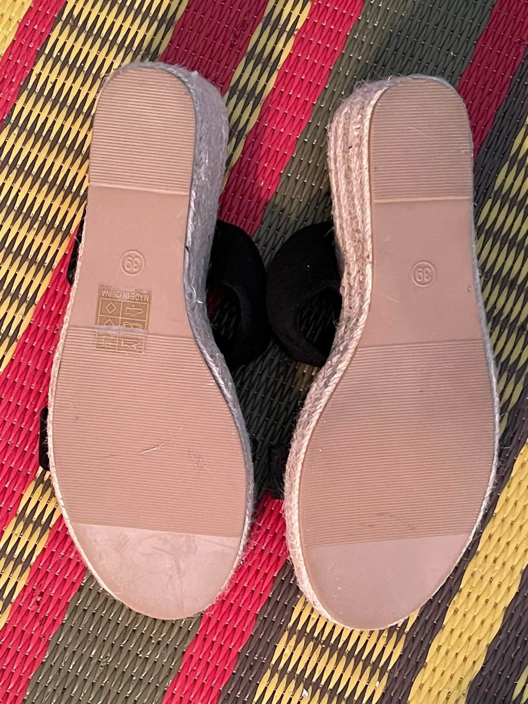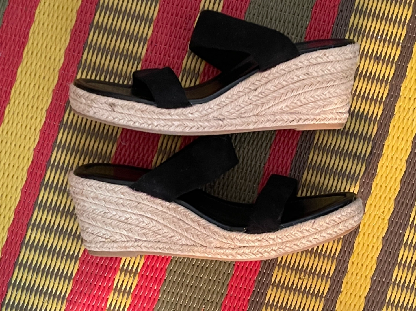 Brand new espadrille type wedge slip on sandals. Man-made materials. Size 39 equals approximately size 8. 3 inch heels.