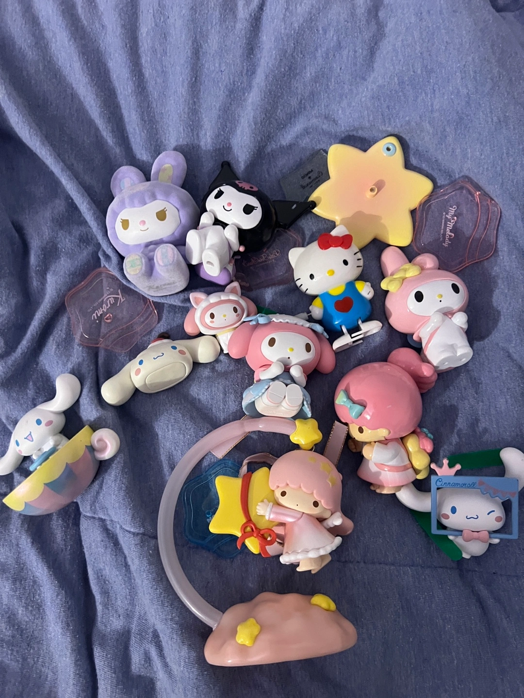 Lot of Sanrio character toys. Includes My Melody, Hello Kitty, Cinnamoroll, and Kuromi. All toys are in good condition.