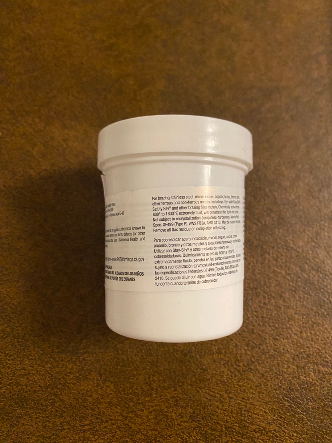 Brand new! Multiple available Pick up near Bathurst and Lawrence Offers welcome! 1/4 lb jars STAY-SILV white brazing flux is an all-purpose, low-temperature flux for use in silver brazing. It is formulated to provide smooth flux application, even coverage and excellent protection during braze heating cycles. It can be used with most ferrous and non-ferrous metals. It is not recommended for aluminum, magnesium or titanium. Ideal for silver brazing cast iron, copper, brass, bronze and steel. Features Homogeneous brazing flux ideally suited for use with a variety of base metals. Formulated to provide smooth flux application, even coverage, and excellent protection during braze heating cycles. Recommended for brazing copper and copper alloys (except aluminum bronze), steel, stainless steel, nickel alloys and other ferrous base metals. Used with many high silver brazing filler metals. Suitable for use with many phosphorus-copper-silver alloys and brazing copper to brass. Use on applications requiring normal heat. For use with silver brazing alloys on all metals except aluminum, magnesium, or titanium. Activity range of 1050°F - 1600°F ° (565°C - 870°C) Meets specification AWS A5.31 Classification FB3 A; AMS 3410; Federal Specification O-F-499, Type B; EN 1045 Type FH10