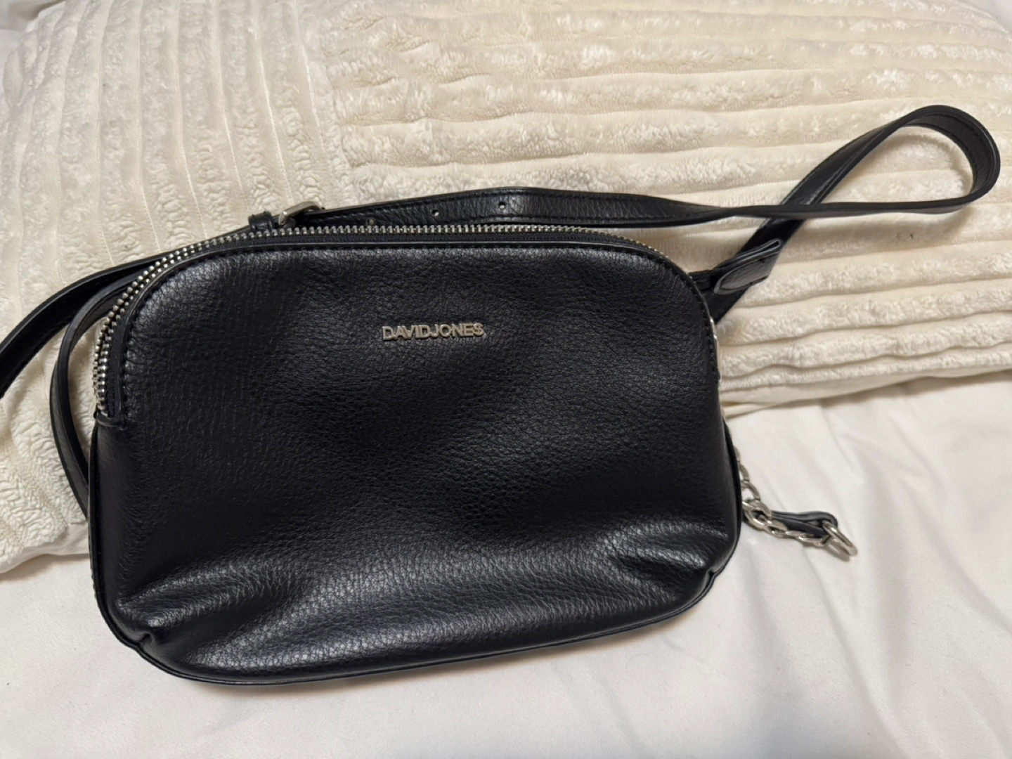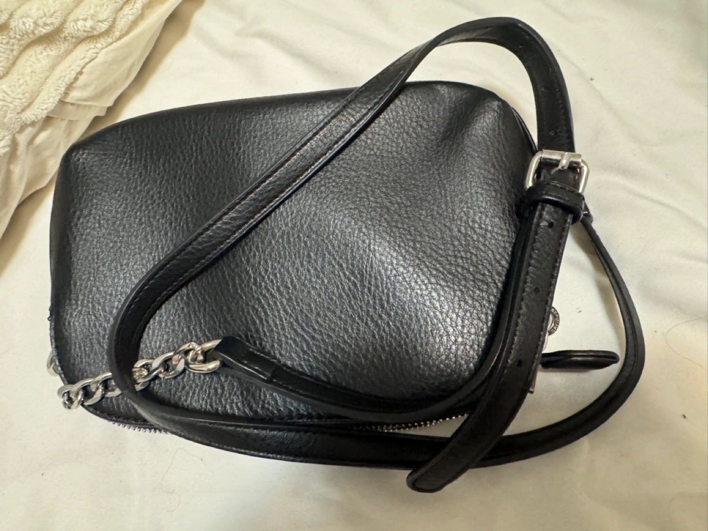 Black leather crossbody bag with a chain strap and zipper closure. Pick up Isabella & church Cash only
