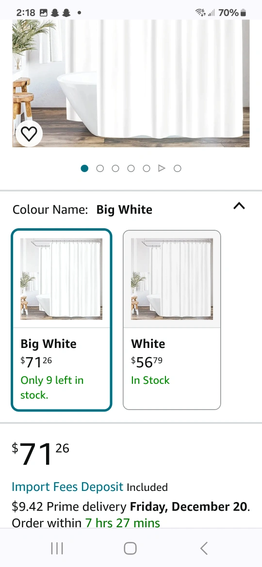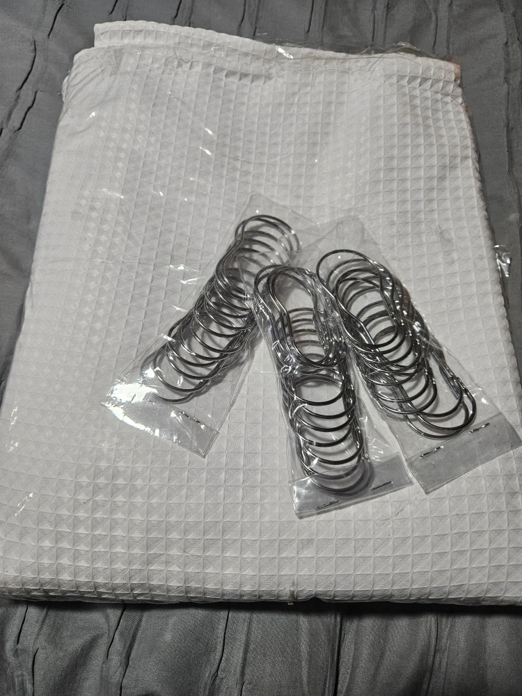 White waffle shower curtain with hooks. 72 x 72 inches. Heavy duty fabric, water resistant, machine washable.this goes all around the tub