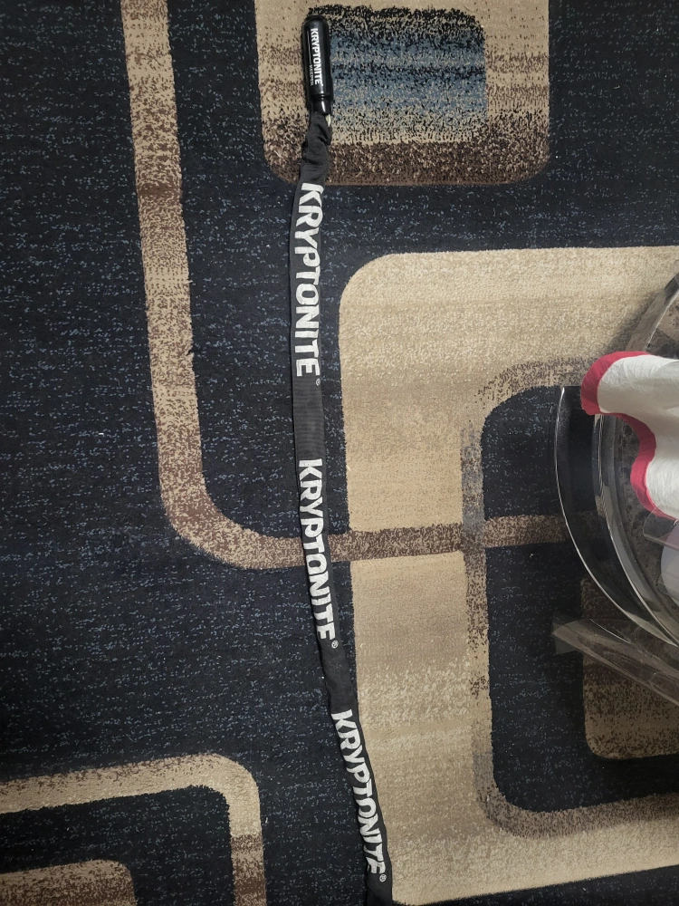 Bike chain lock with keys. Black with white lettering.