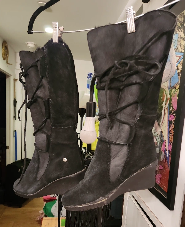 UGG Elsey Women Size 9 Black Suede Wedge Boot Mid Calf Lace Up Sheepskin Lined Do you luv a wedge in winter? This UGG Elsey women's size 9 black suede leather wedge mid calf boot is ready for all of your adventures. It laces up for style and attitude. The wedge gives a sleek look. Sheepskin lined for warmth and comfort. Good condition. Normal wear. Spots around. Suede has normal rubbing on back and around bottoms. Normal sole wear. This is a pre-owned item and may have fading or discoloration, marks or stains, scratches, wrinkling, wear on straps, corners, trim, and texture. If this is an issue, buyers should purchase items brand new. **I'm not the manufacturer or a shoe store, so don't have and can't provide you with fit advice on shoes. This is from a non-smoking, pet free home. * Cash Only * * No E-transfers * * Pickup Only * * Serious Offers Only *