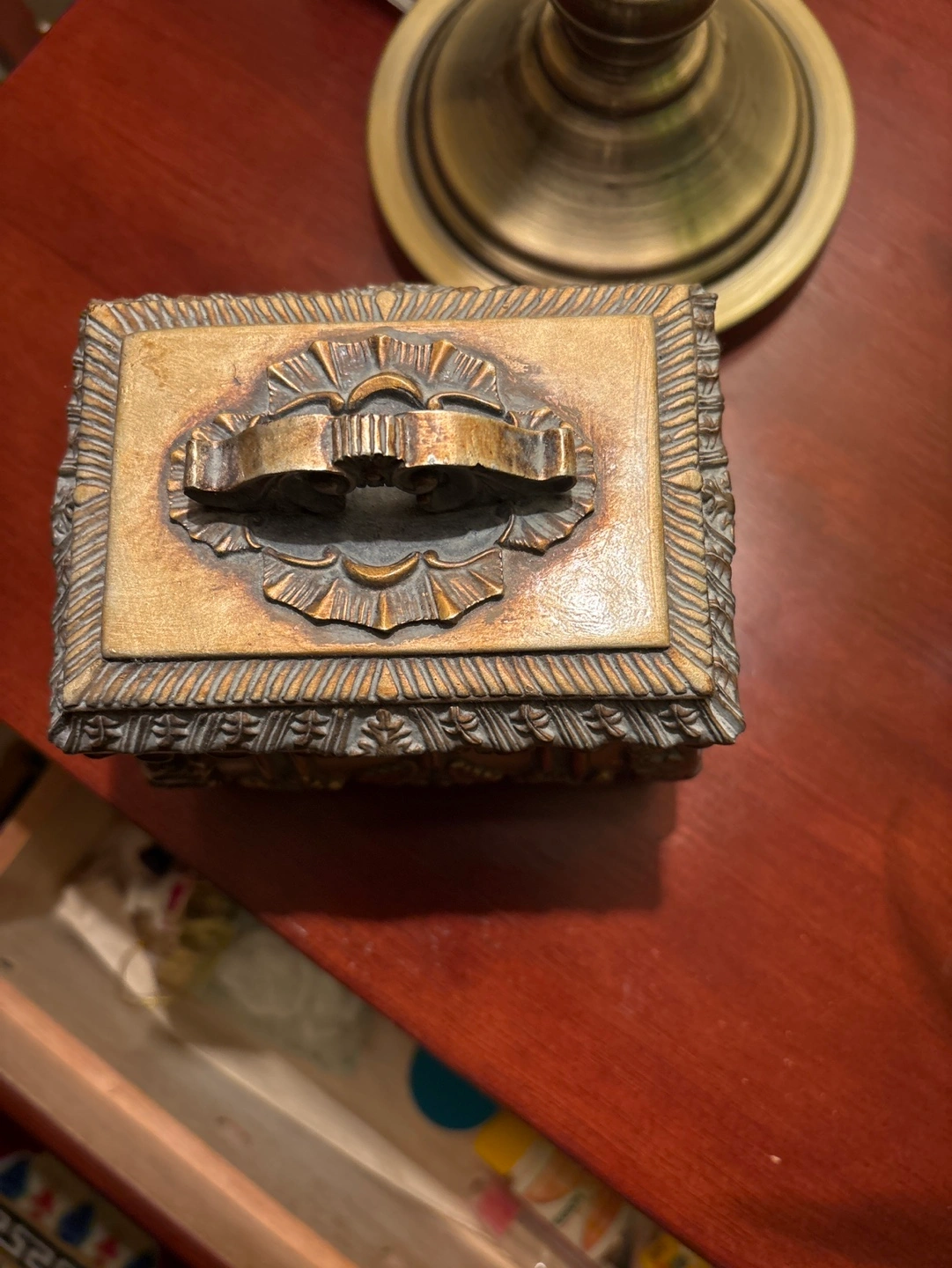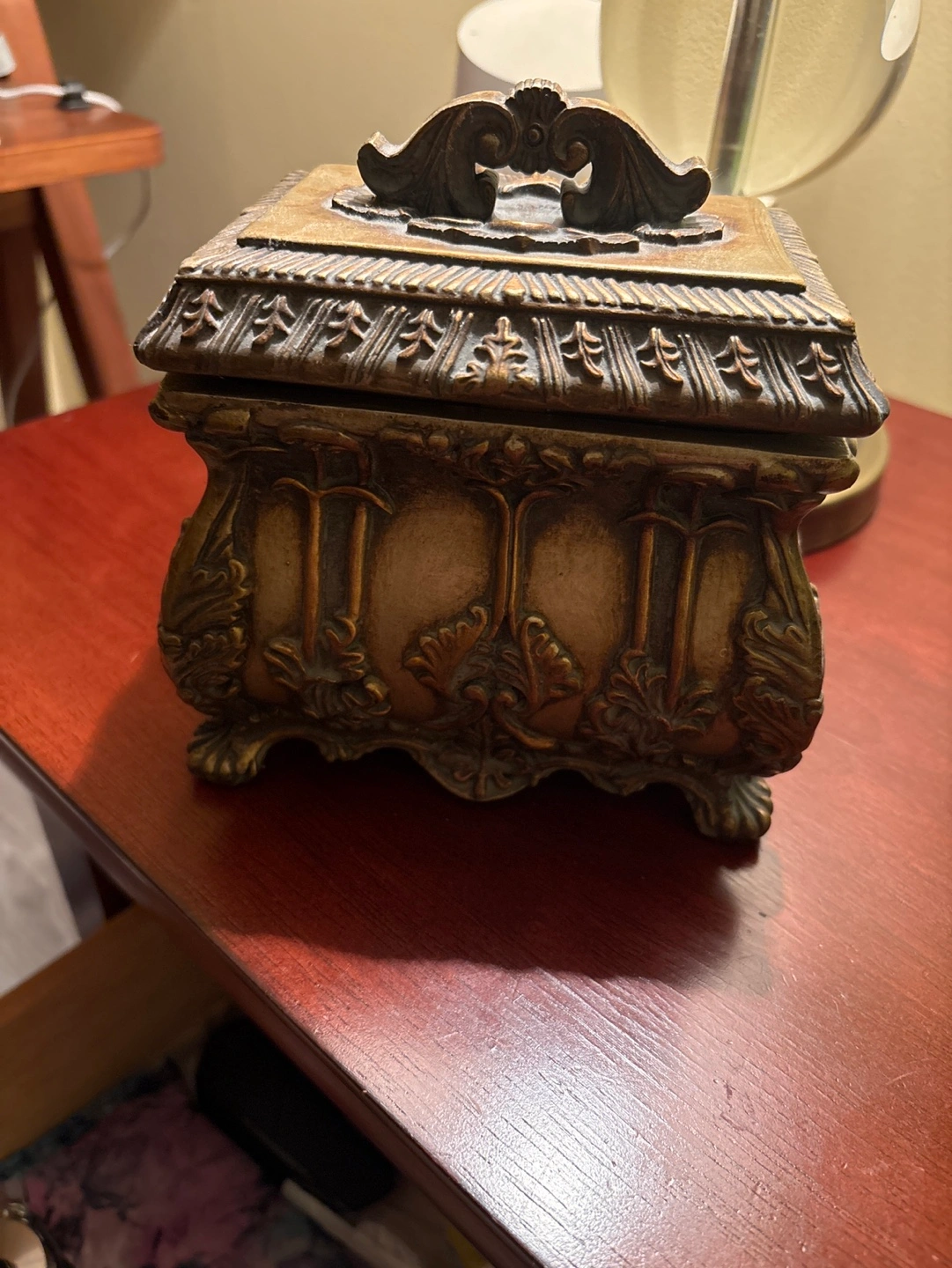 Ornate decorative box with gold and brown accents. Features an intricately designed lid and four feet. It’s never used as I hbought 2 fir gifts 🎁