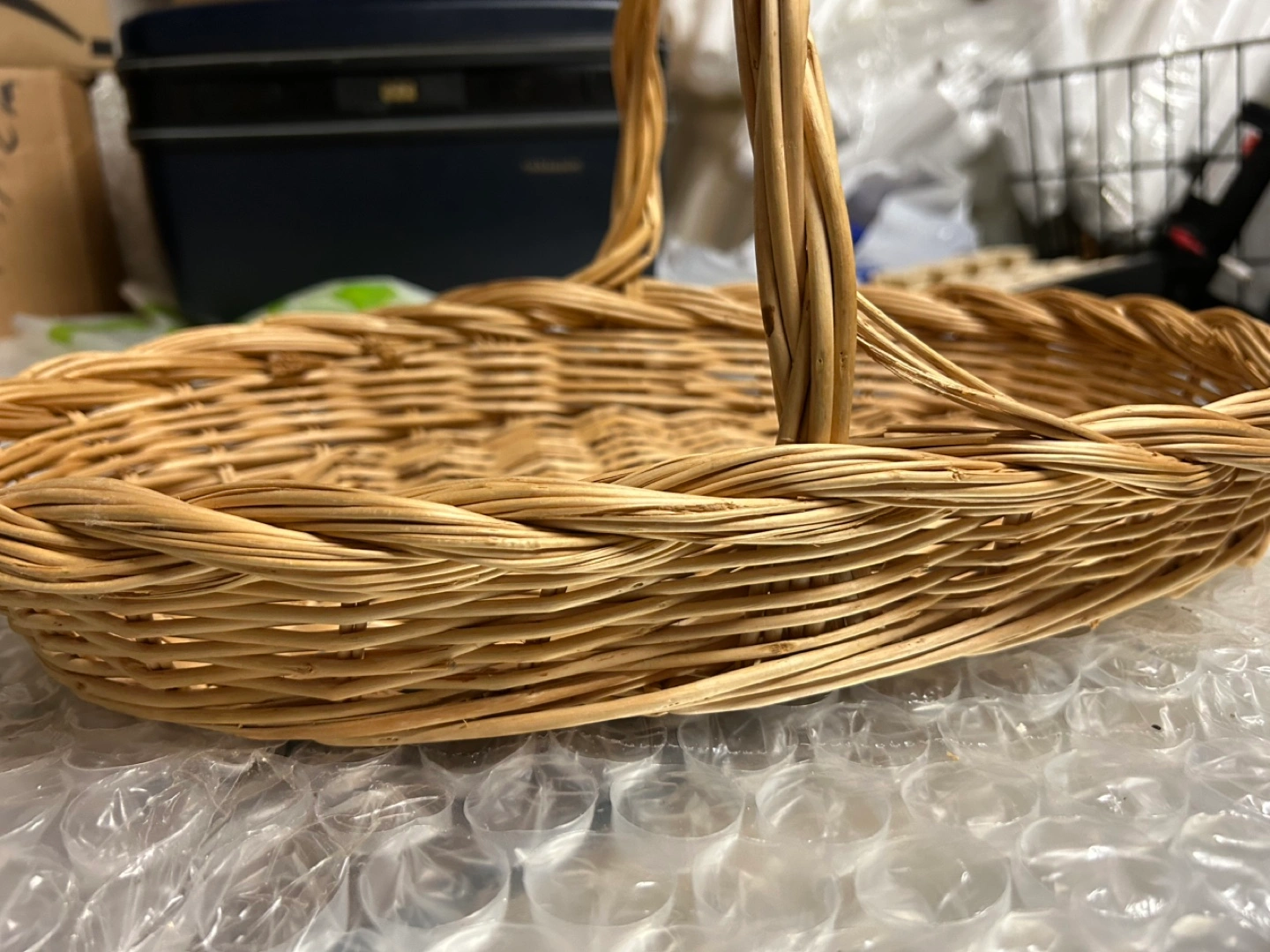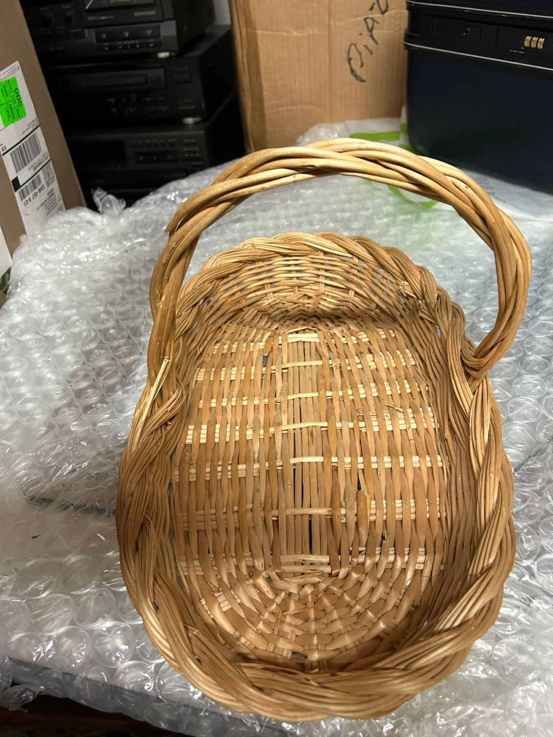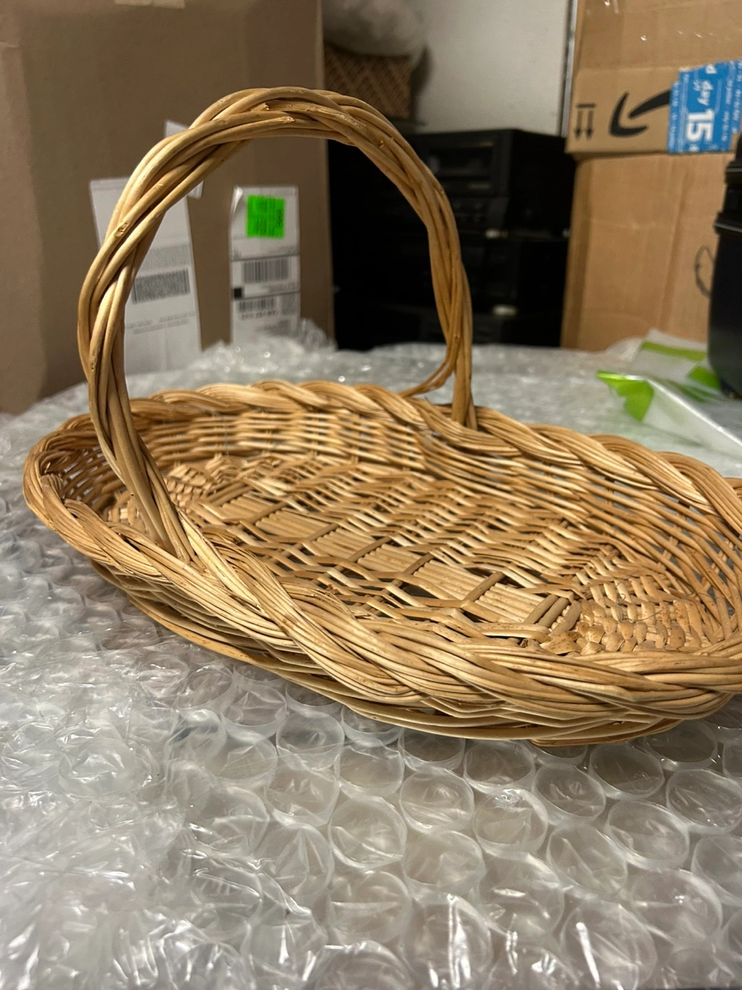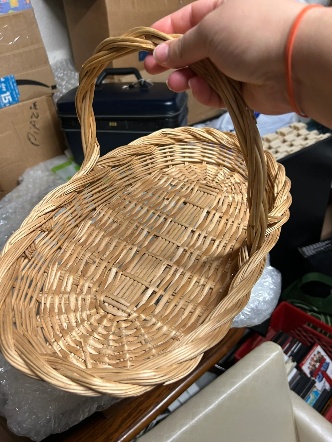 Oval-shaped wicker basket with a handle. Perfect for a gift basket, home decor, or for storing small items. A light brown color, lighter in person than the photos.