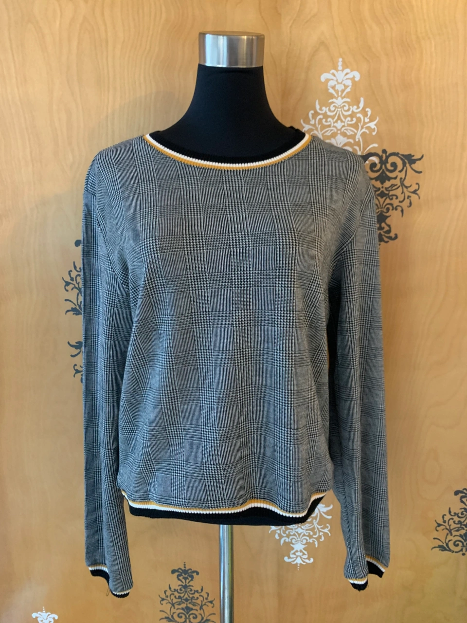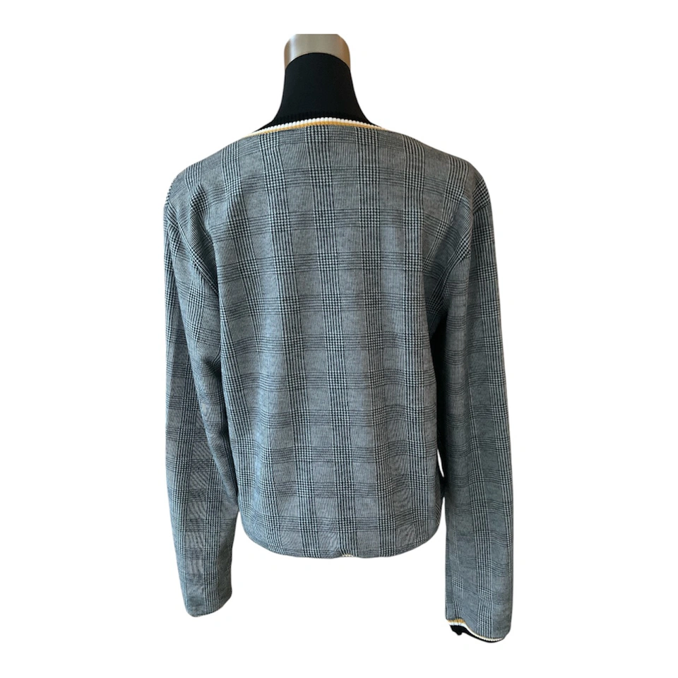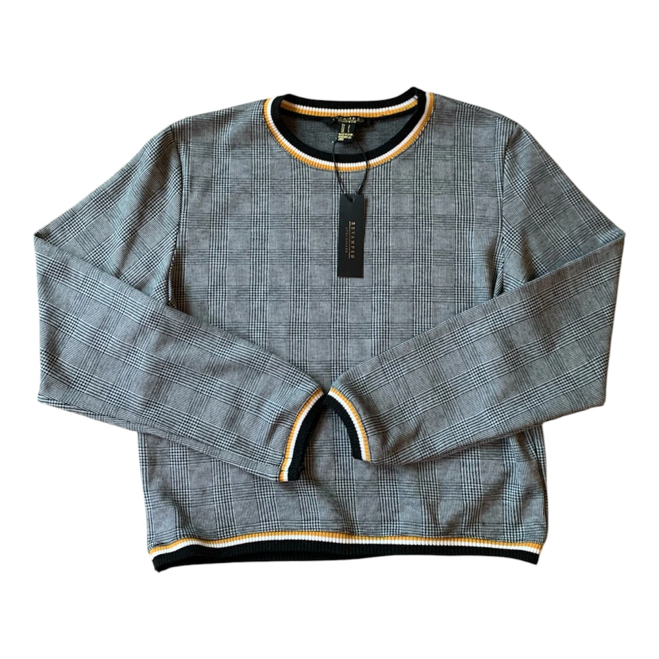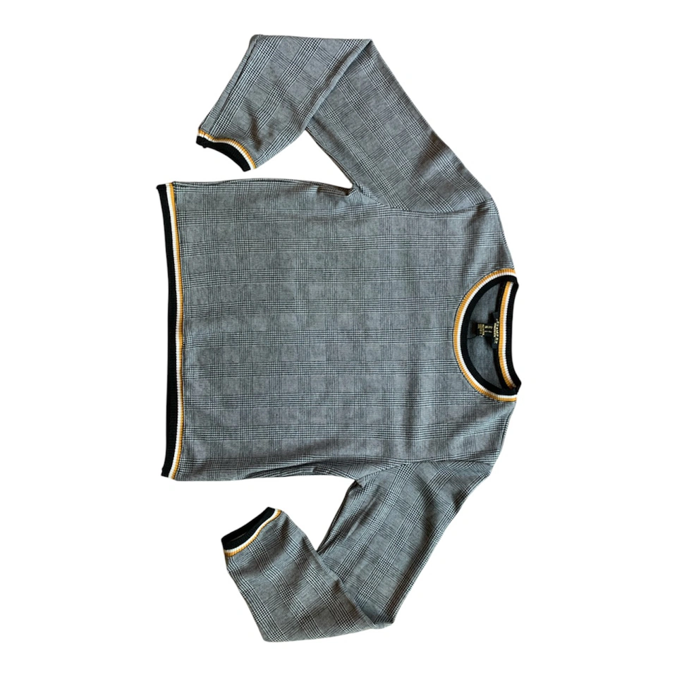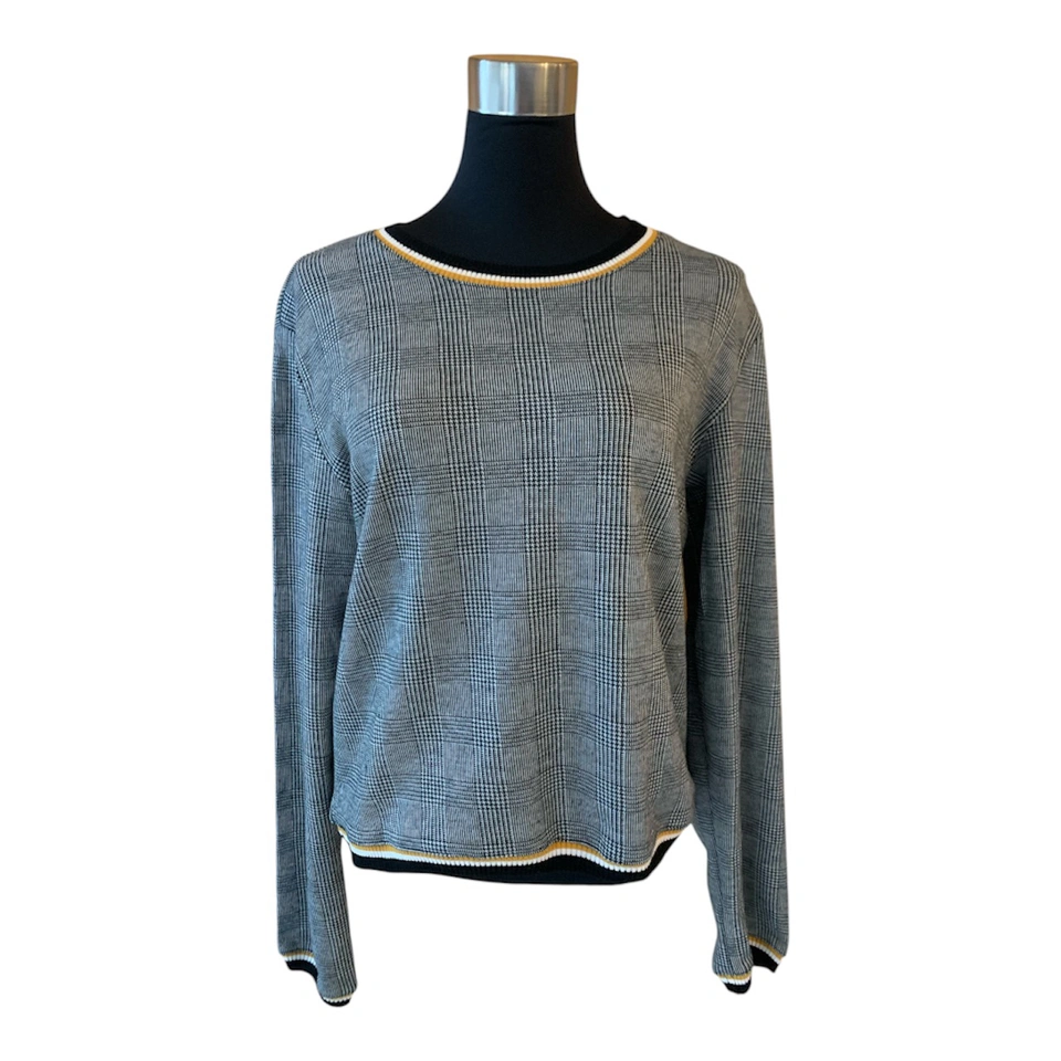 NWT Grey, Black, & White Checkered Preppy Plaid Sweater with Yellow Pattern Trim Outline NWT! Condition: 10/10. No Stains/Rips/Tears. Measurements (Inches): **Clothing measured on flat surface - ONLY LEFT TO RIGHT - NOT ALL AROUND CIRCUMFERENCE Tag Size: Small. Can also fit a size XS & Medium Shoulder to shoulder: 17 Bust: 18 Waist: 20 Hips: 17 Sleeve Length: 24 Arm width sleeve (top to bottom): 9.5 Length from shoulder to bottom hem: 21 Style Details: .Colour: Checkered Pattern - black, grey, & white stripes. Stripe patterned collar/hemline trim/sleeve trim colours black, white & yellow .Scoop neckline .Slight cuffed sleeves and hemline .Preppy & casual .Material: 65% Polyester/32% Raton/3% Spandex Local pick up downtown Toronto King Street West & Spadina or drop off available! Great as a budget friendly Christmas gift!!! New and tagged