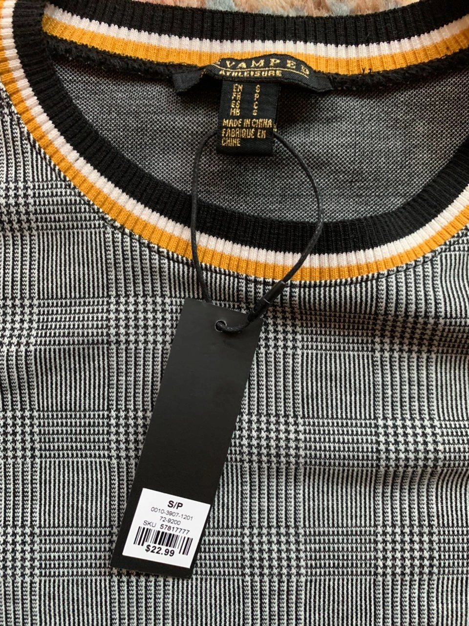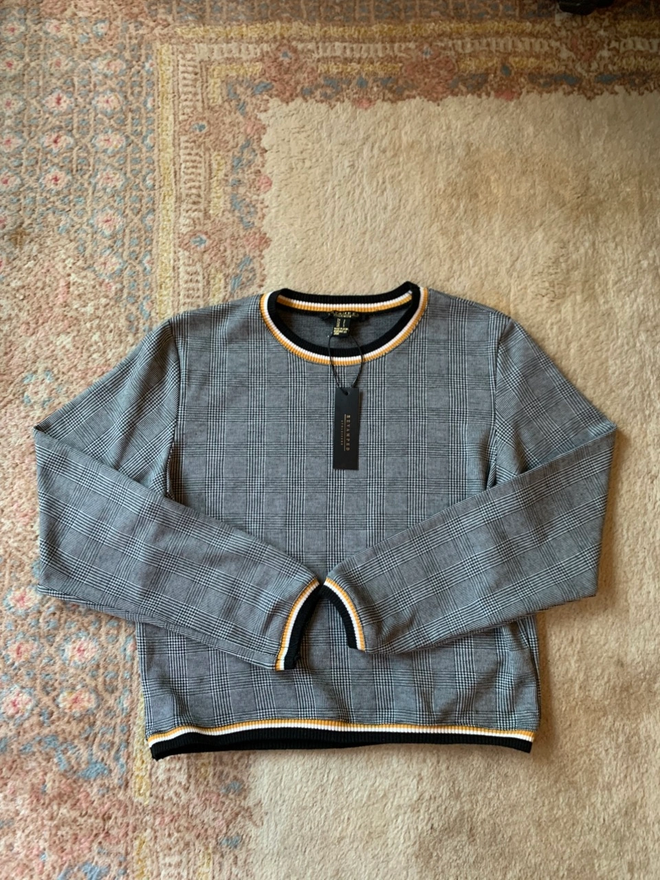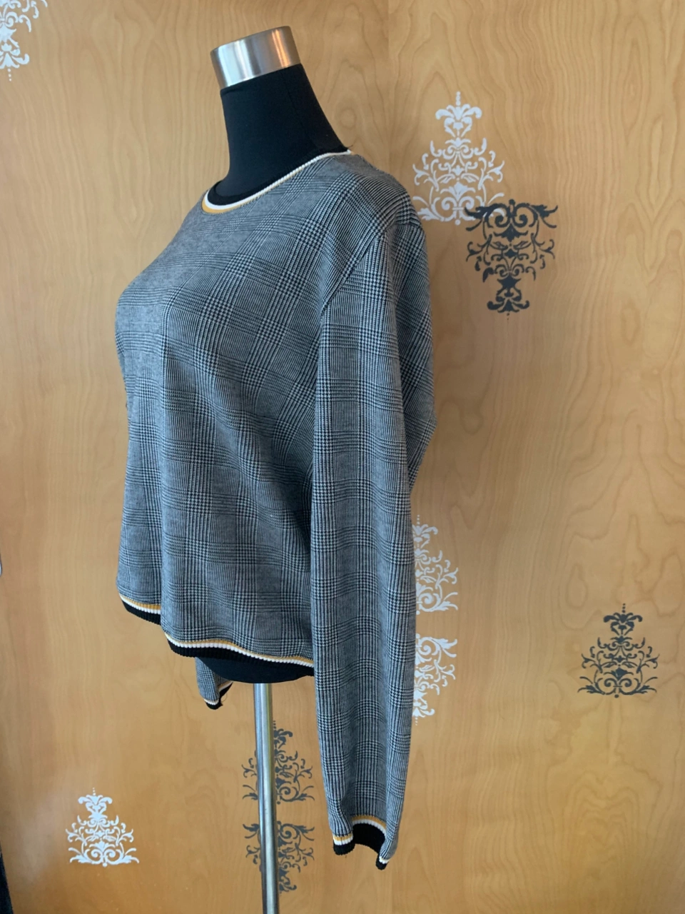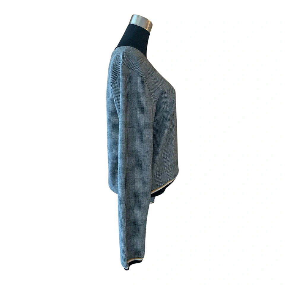 NWT Grey, Black, & White Checkered Preppy Plaid Sweater with Yellow Pattern Trim Outline NWT! Condition: 10/10. No Stains/Rips/Tears. Measurements (Inches): **Clothing measured on flat surface - ONLY LEFT TO RIGHT - NOT ALL AROUND CIRCUMFERENCE Tag Size: Small. Can also fit a size XS & Medium Shoulder to shoulder: 17 Bust: 18 Waist: 20 Hips: 17 Sleeve Length: 24 Arm width sleeve (top to bottom): 9.5 Length from shoulder to bottom hem: 21 Style Details: .Colour: Checkered Pattern - black, grey, & white stripes. Stripe patterned collar/hemline trim/sleeve trim colours black, white & yellow .Scoop neckline .Slight cuffed sleeves and hemline .Preppy & casual .Material: 65% Polyester/32% Raton/3% Spandex Local pick up downtown Toronto King Street West & Spadina or drop off available! Great as a budget friendly Christmas gift!!! New and tagged