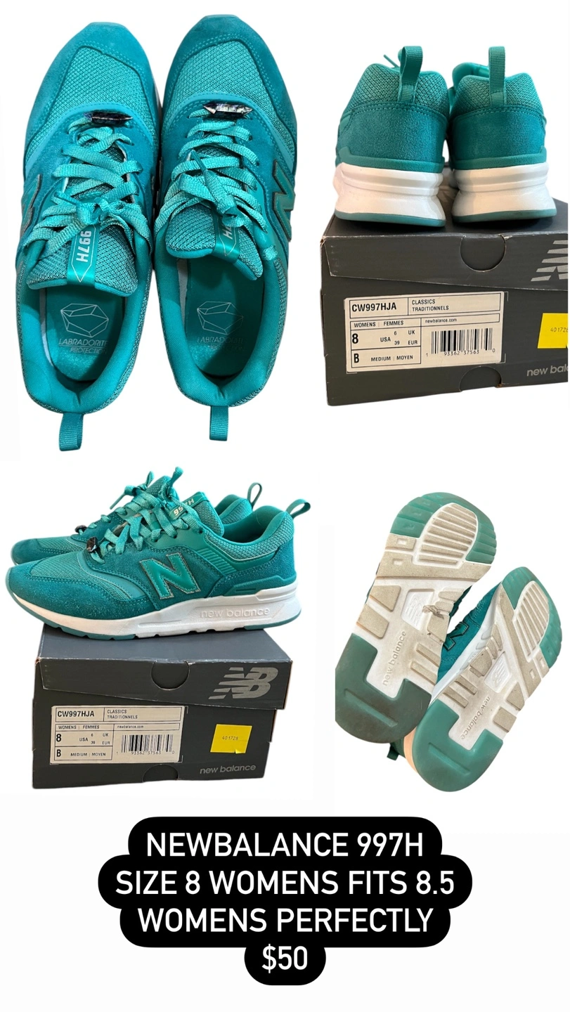 New Balance 997H, size 8 women's, in turquoise, with a white sole.