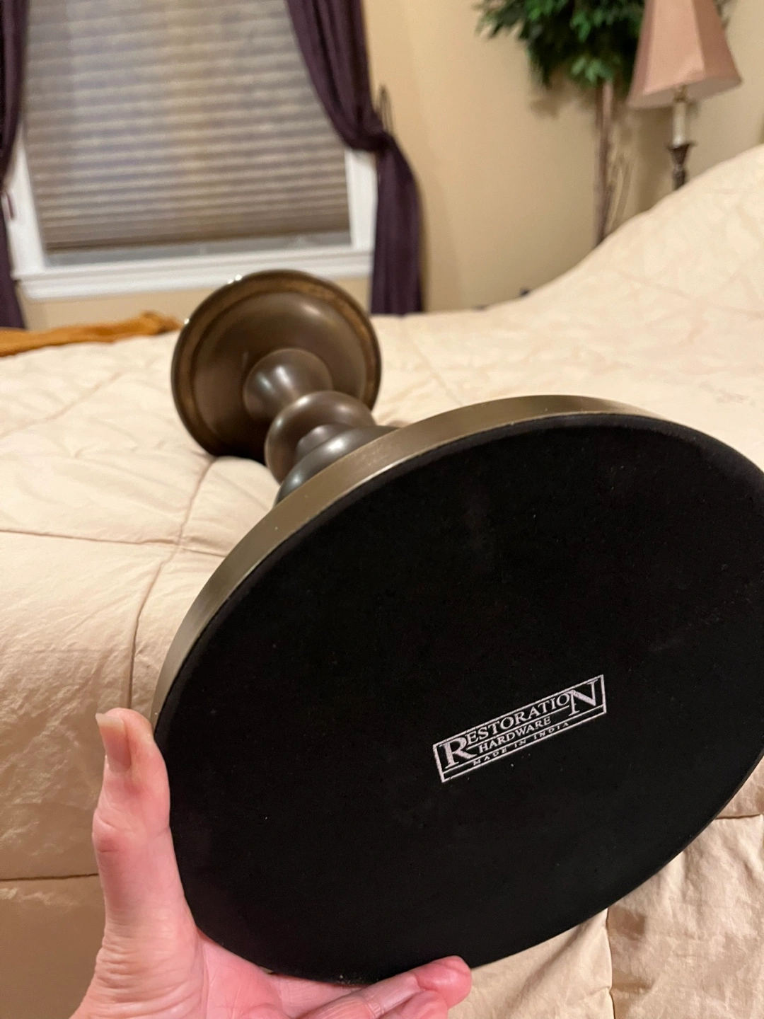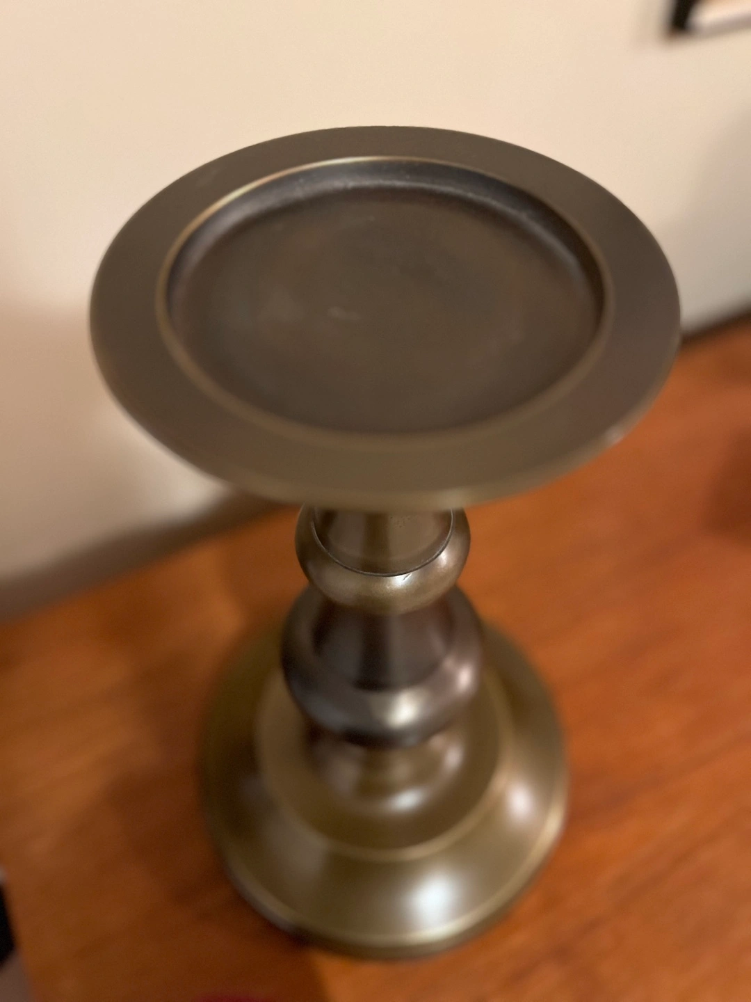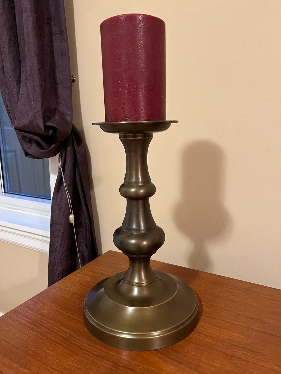 Brass Restoration Hardware 14” tall candle holder with a wide base and a round, smooth top. This candle holder is new. Price includes new pillar candle! No Dents or Scratches. Pick-up East York (Laird/Eglinton). Cash please.