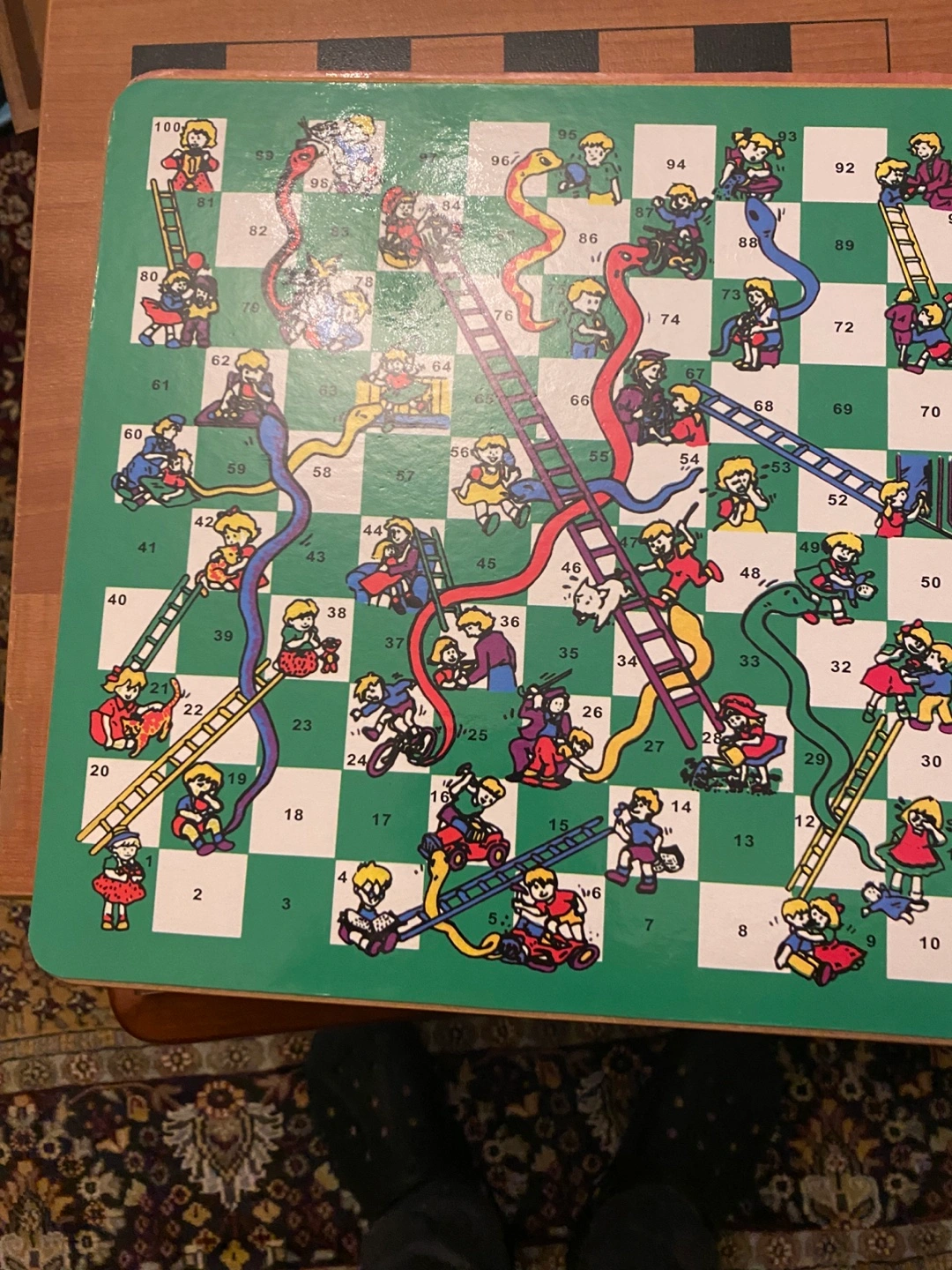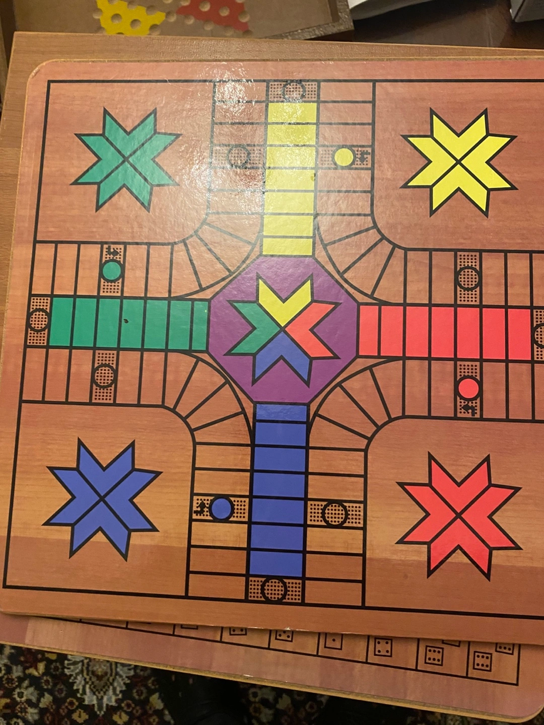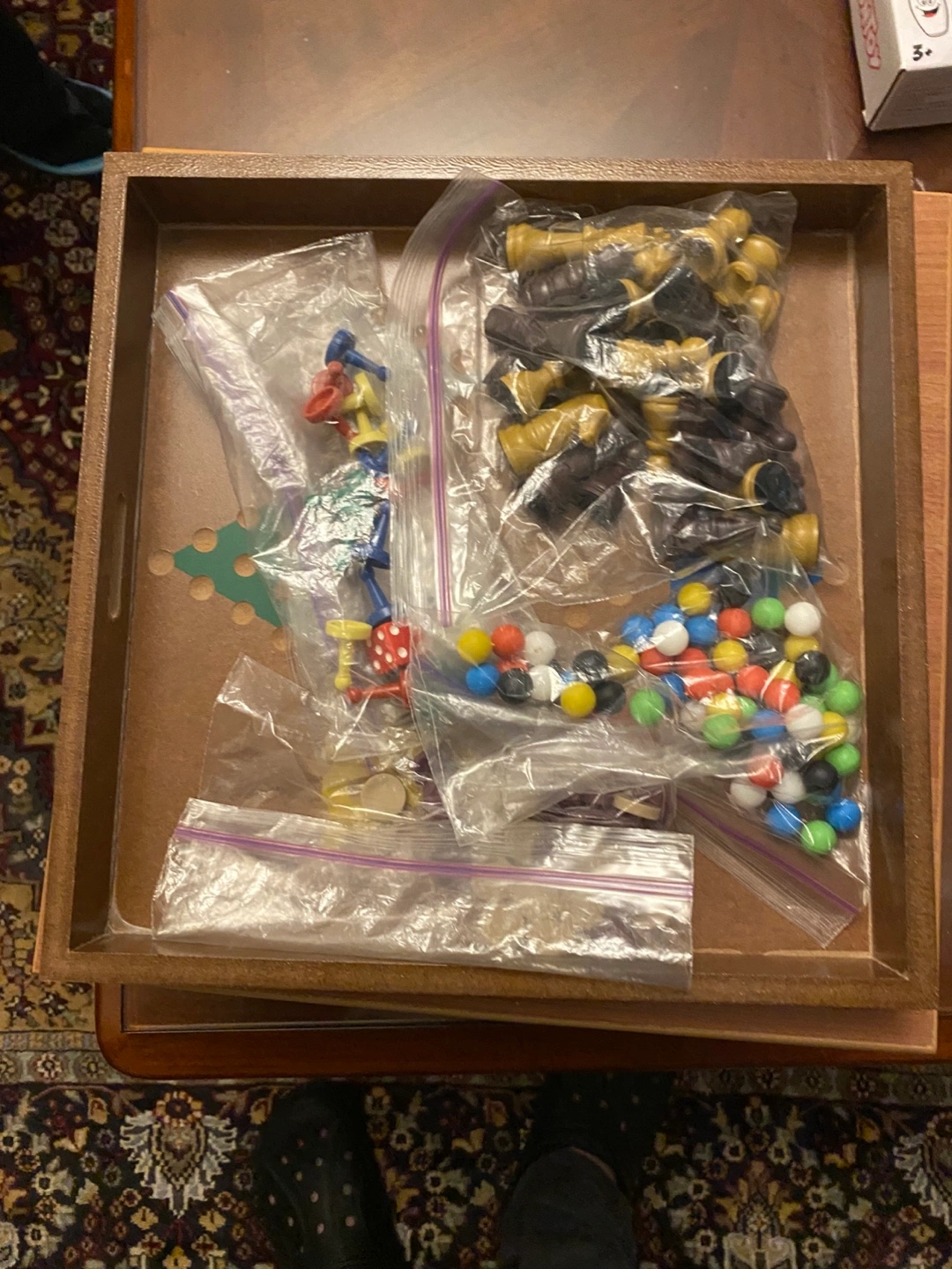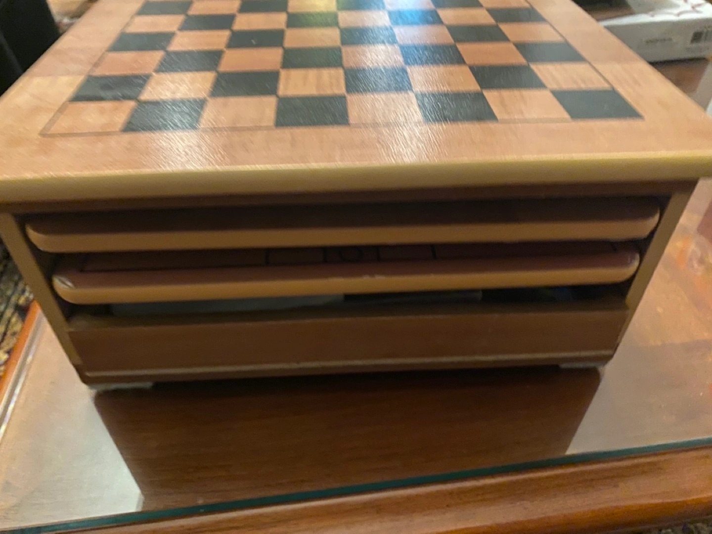 Wooden storage for game set with seven games - Chess, Checkers, Mancala, snakes and ladder, backgammon, Includes all pieces for each game. The set is in very good condition.