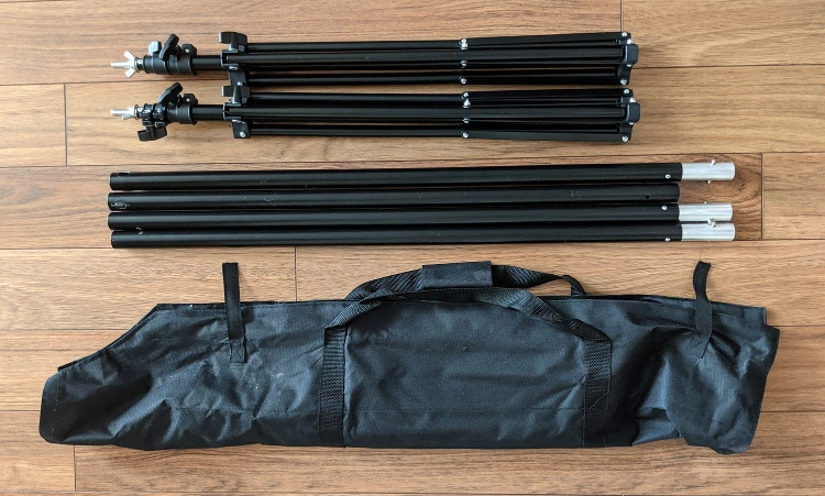 Background stands are adjustable up to 78 inches high. Crossbar is adjustable up to 116 inches wide and comes in four pieces. The hardware fits into the carrying case. The three fabric backgrounds (black, white, green) are each 108 x 136 inches. This set was sparingly used so it is in excellent, almost like-new condition. See pics. $100. Pick-up in downtown Toronto (Richmond / Sherbourne).