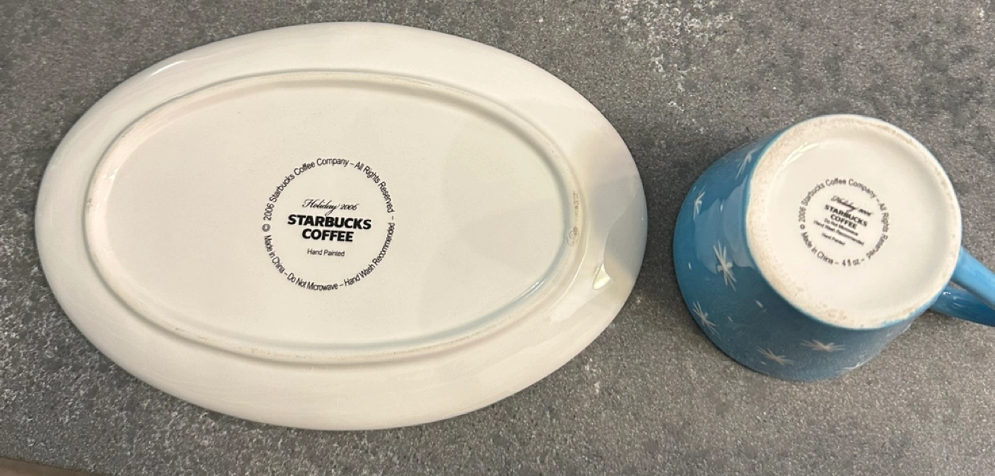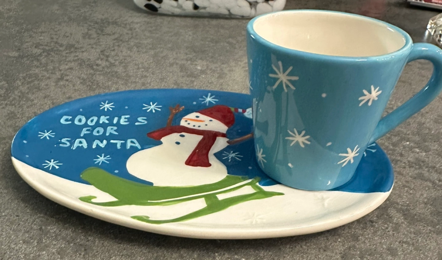 Blue mug and plate set with snowman design. The plate says "Cookies for Santa" and features a snowman on a sled.