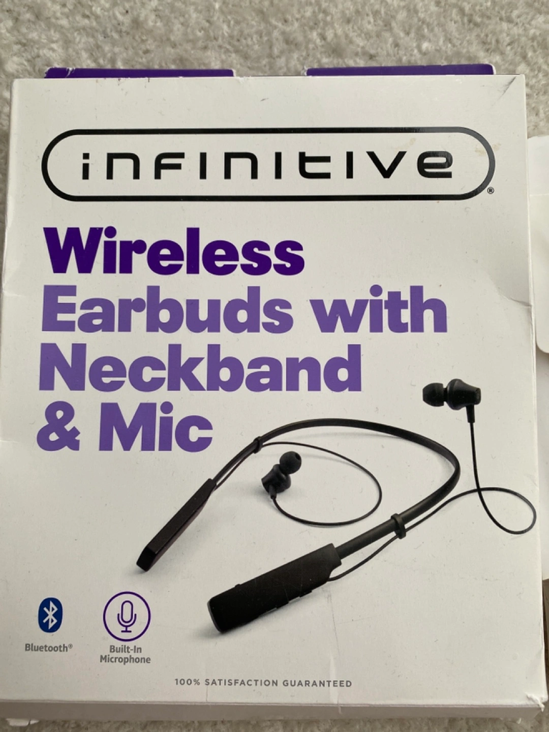 Wireless earbuds with neckband and mic. Black. Bluetooth and built-in microphone. No charger cable it’s missing.works , I don’t need anymore Pick up Homewood Avenue #freecyle