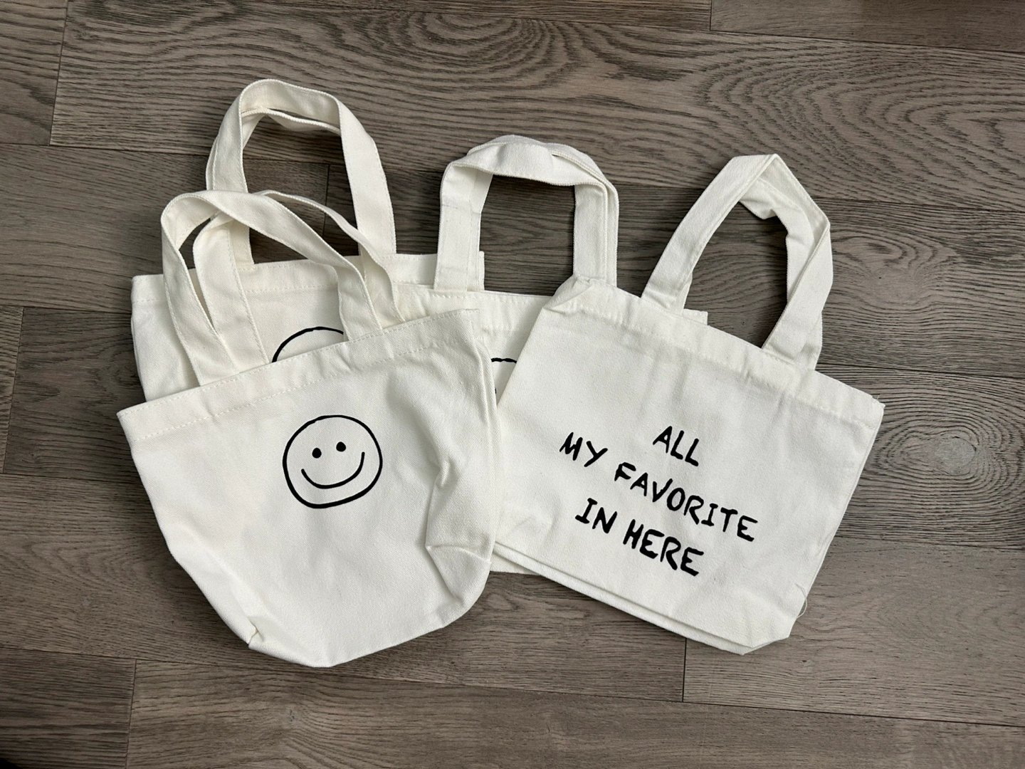 Set of 4 mini tote bags. Each feature a smiley face on one side and on the other, 'All My Favourite In Here'. Pickup: Yonge and Finch PFSF Clean Home