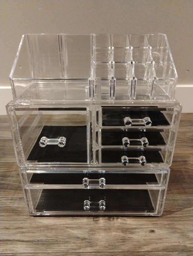 Clear acrylic organizer with multiple compartments and three drawers. Perfect for storing makeup and other small items. selling $40 Firm on price