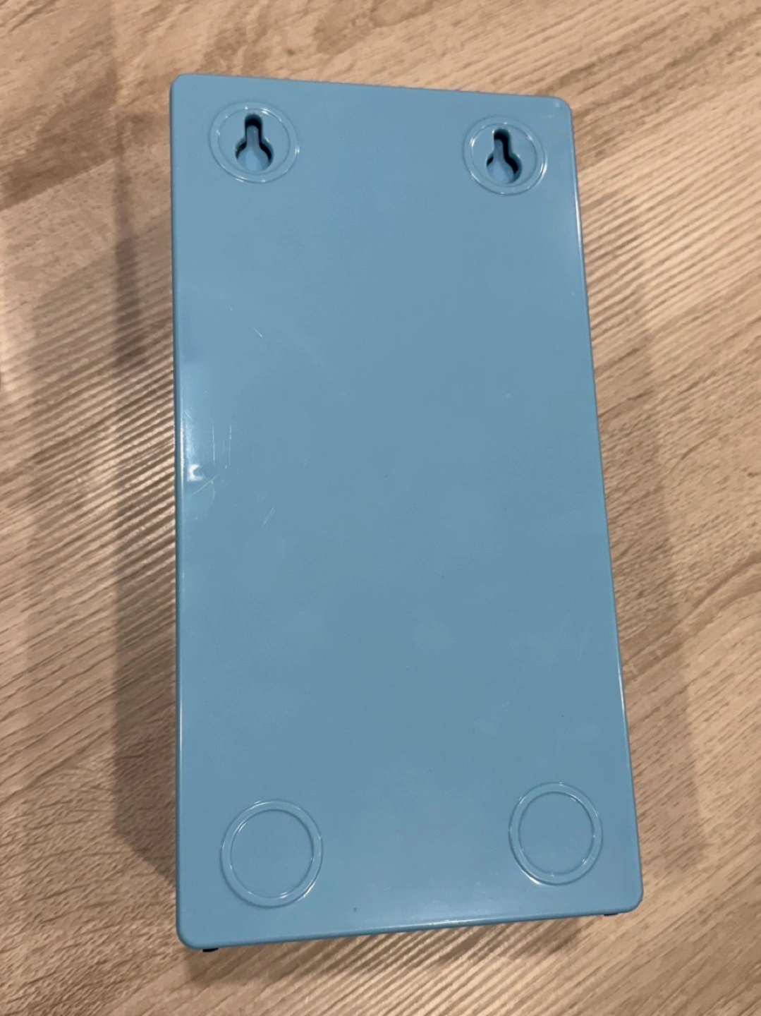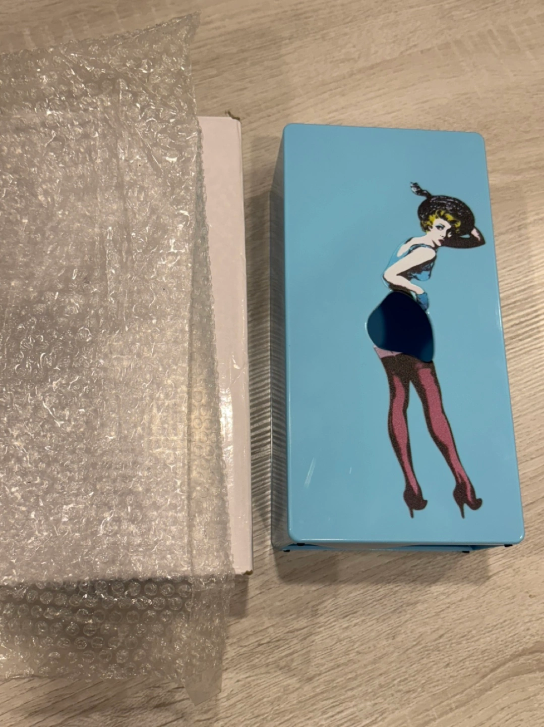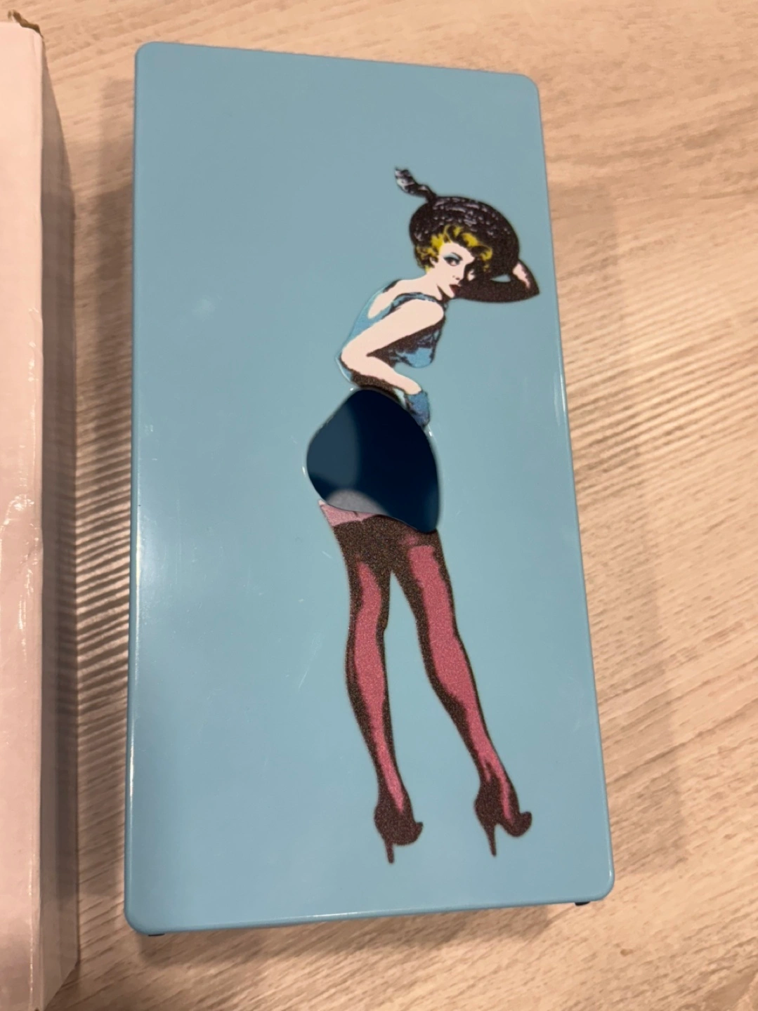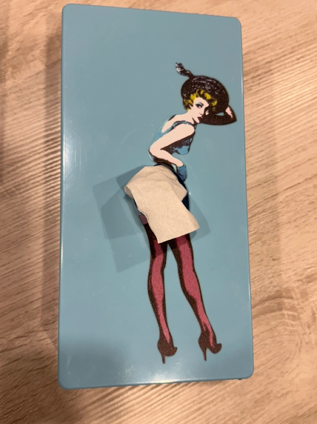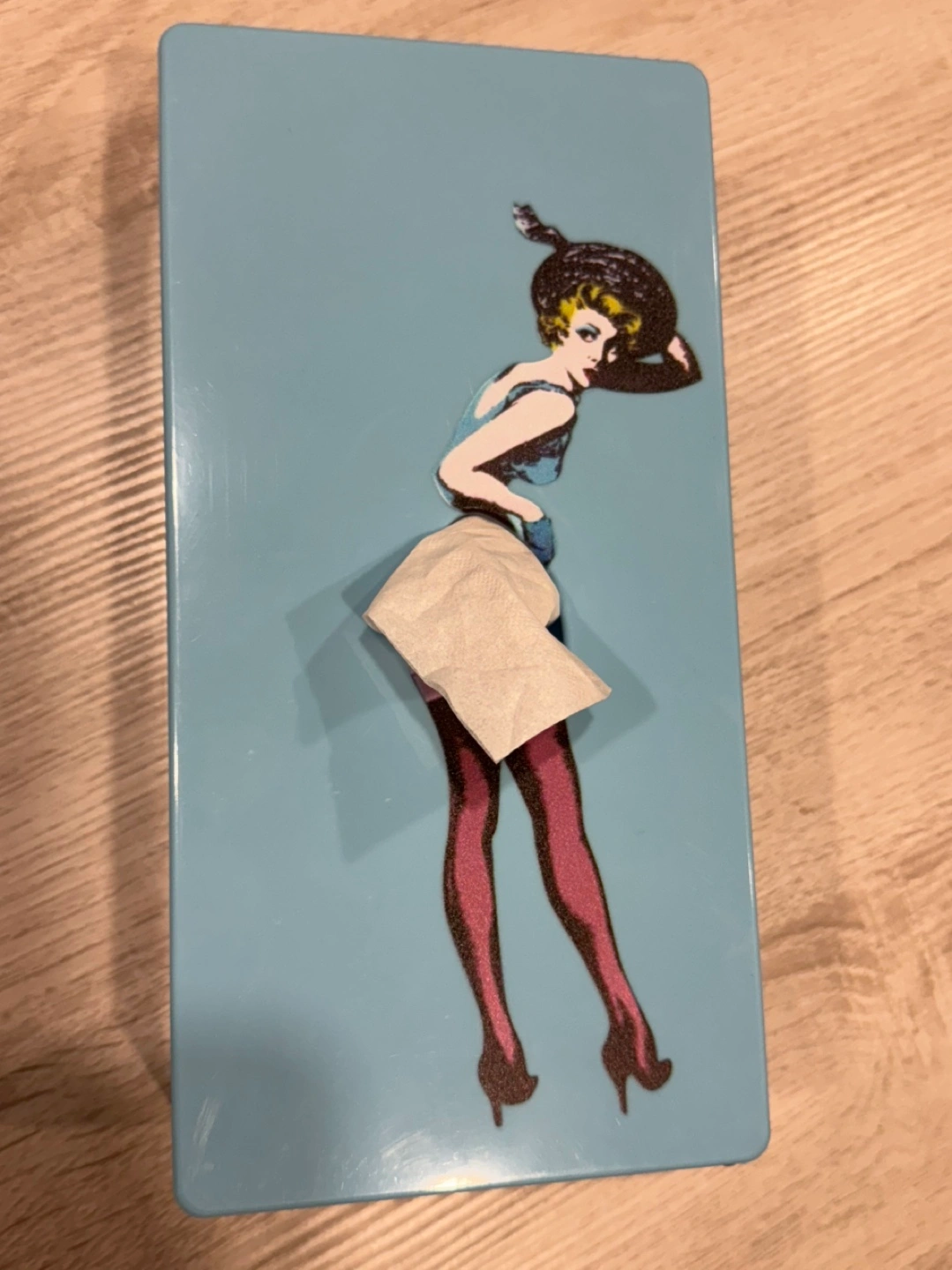 Tissue box cover with a blue finish and a pinup girl design. Can be hung on the wall with two holes on the back.