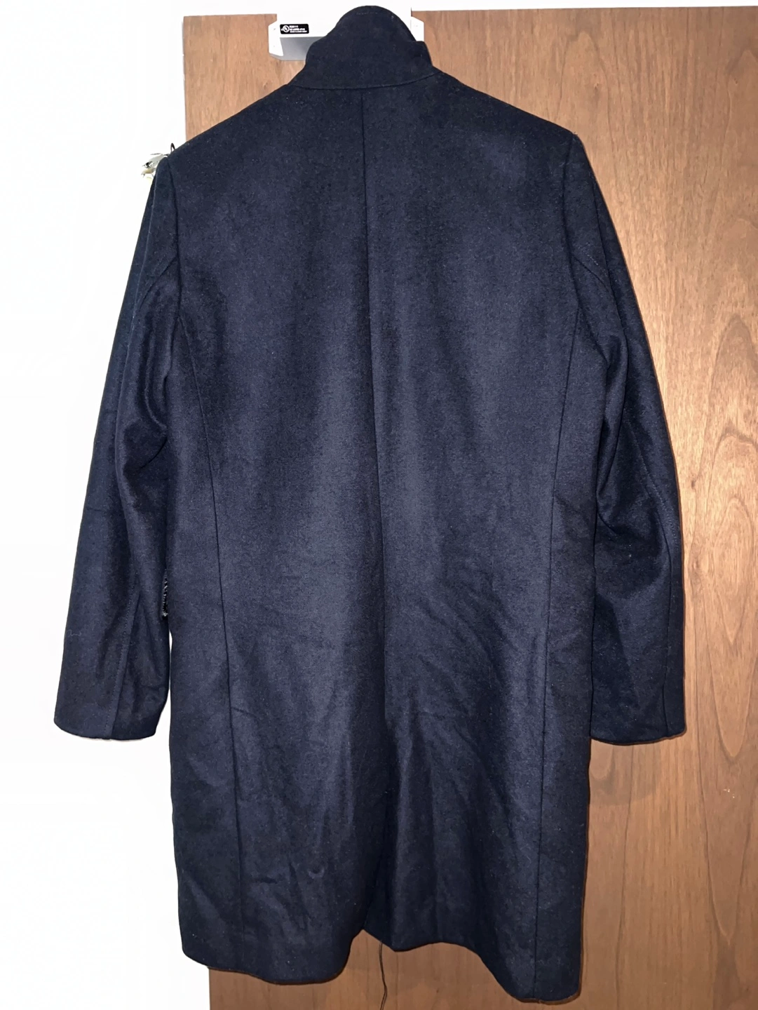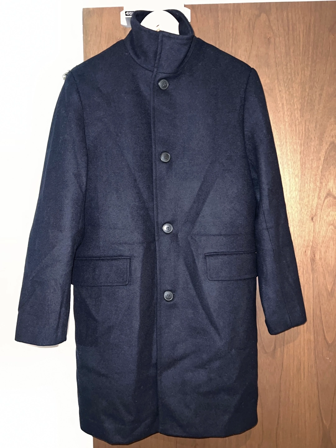 Navy blue wool blend coat with a high collar and button closure. Long sleeves, pockets, and a straight fit. Never used it, bought it 109$ before tax selling for 60$ Pick up at Bathurst and Fort York