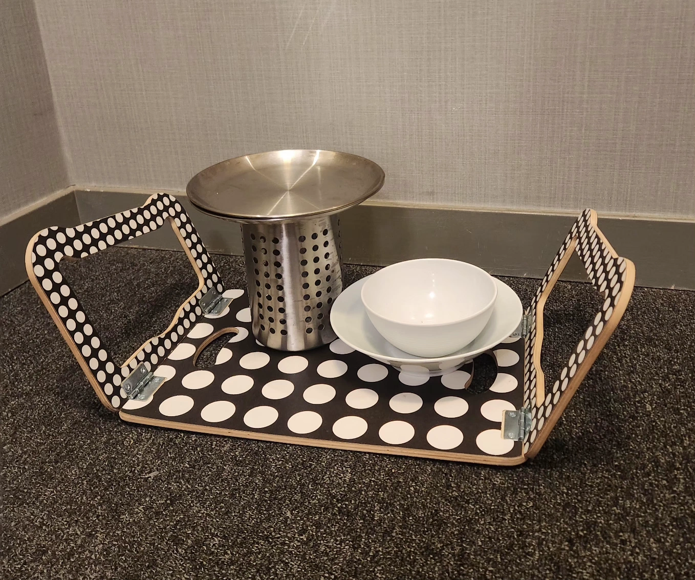 Folding tray with black and white polka dot design. Includes a metal bowl and 2 steel plate plus a white coffee press. **** Pickup Only **** *First Come/ First Serve * *** No Holds/ No Reserves ***