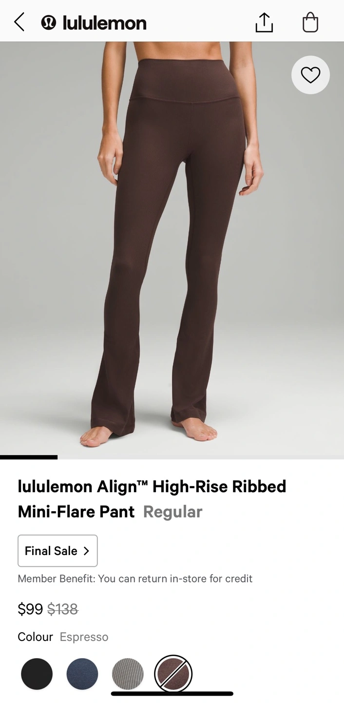 Lululemon Align™ High-Rise Ribbed Mini-Flare Pant in Espresso. Regular fit. Brand new with tag Size 4 $100 cash